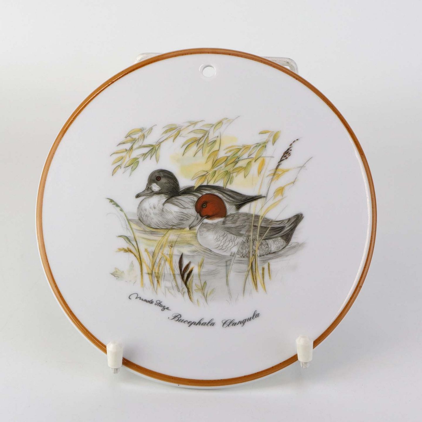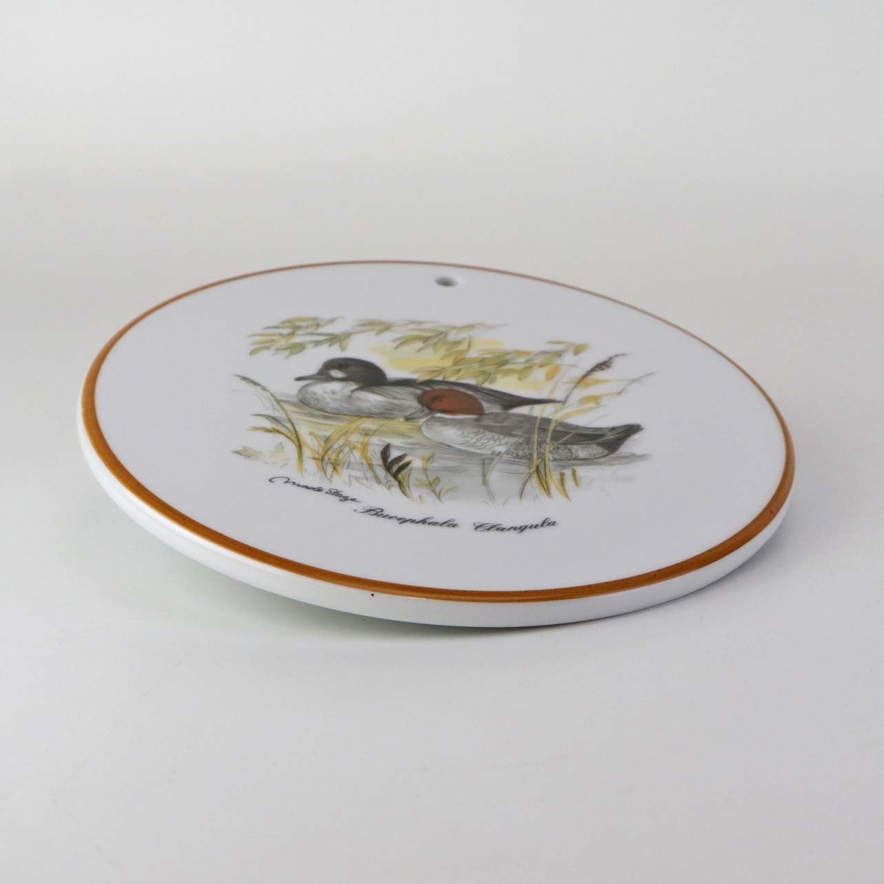 Text available in Danish: Rund smørbrik i porcelæn med forboret hul til ophæng og motiv af ænder fra stellet Jagtstel.