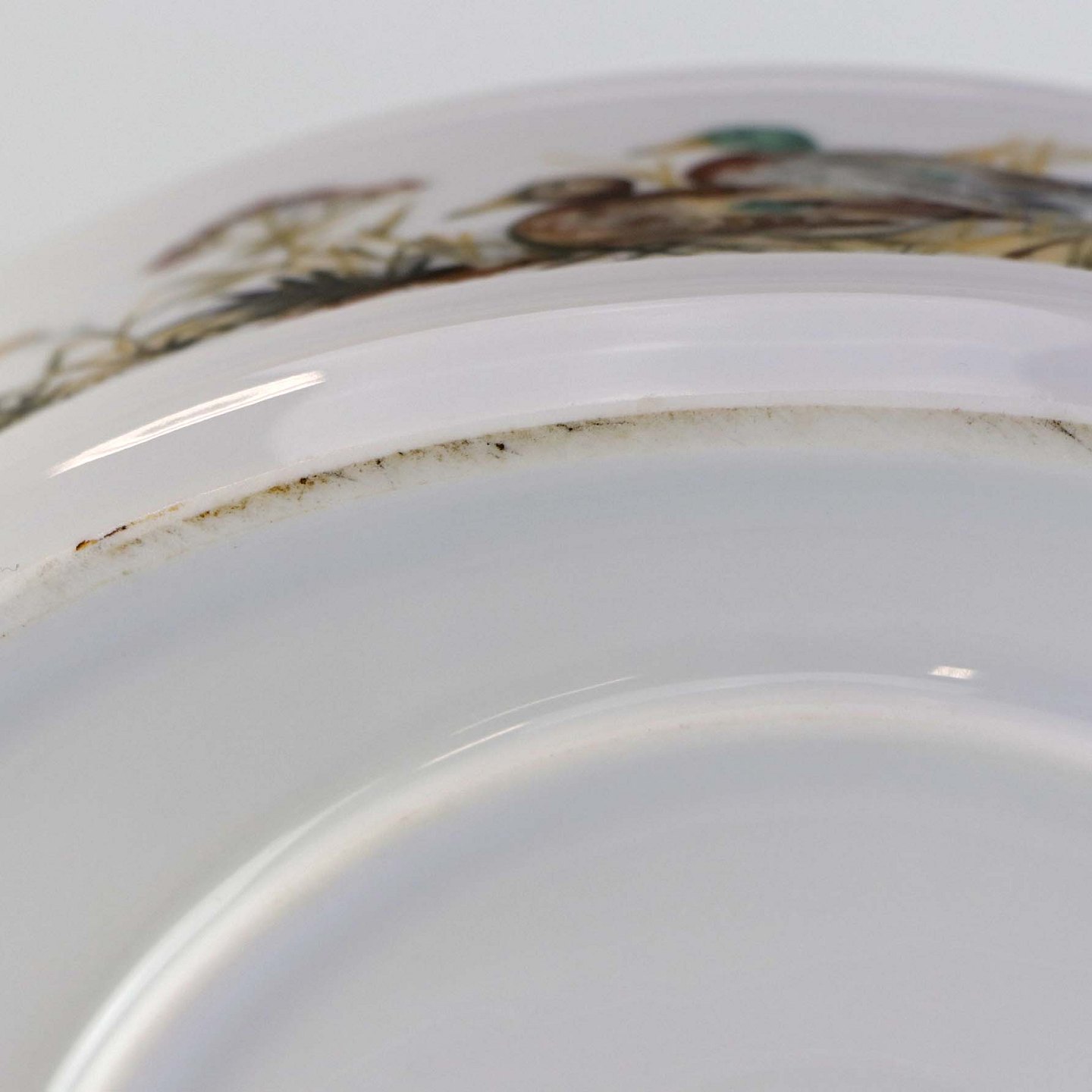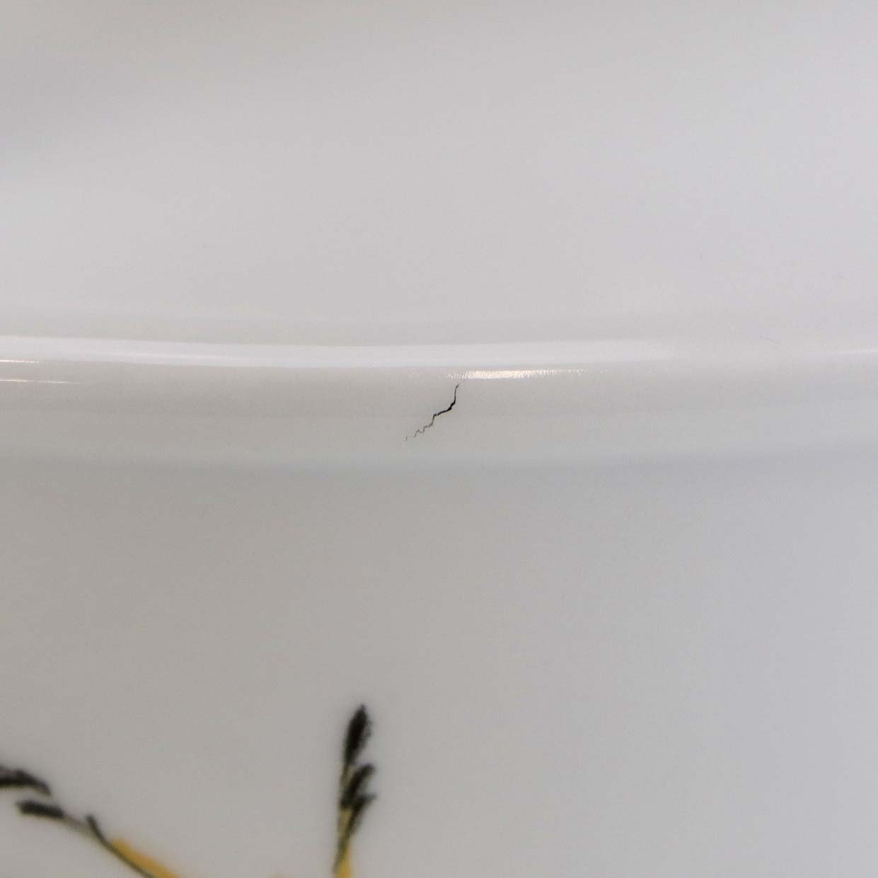 Fremstår med en mindre mørk streg under glasuren samt brugsspor under bunden.