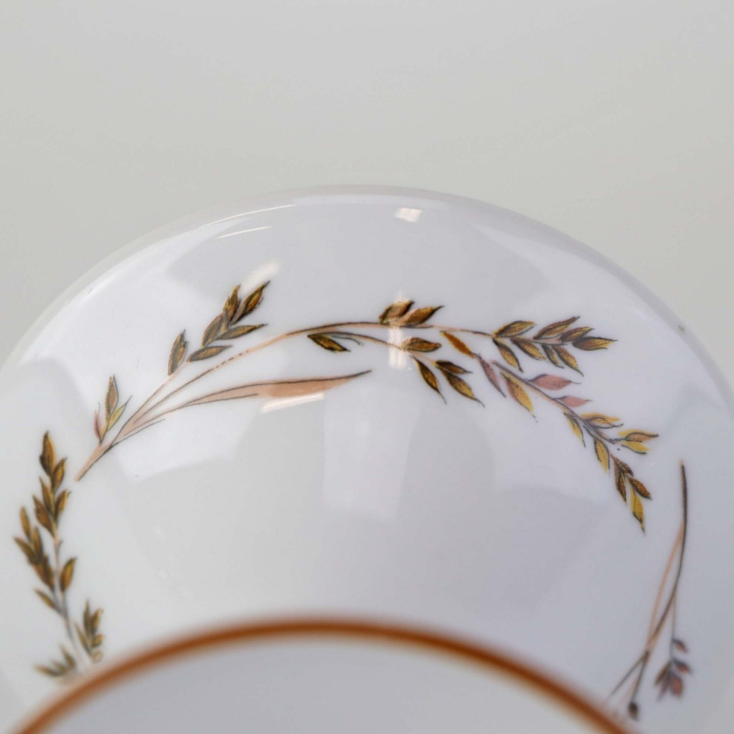 Jagtstellet er i glat hvidt porcelæn med gyldenbrun kantdekoration og motiver af forskellige vilde danske dyr i deres naturlige miljø. Stellet er holdt i dæmpede varme efterårsfarver.