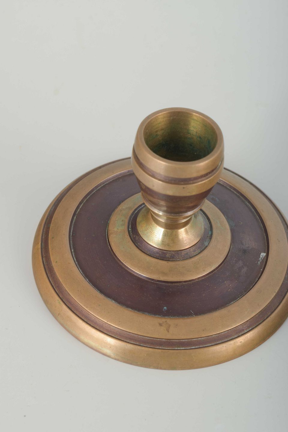 Solid brass candlesticks with circular base and geometric ring decorations, typical of the period.