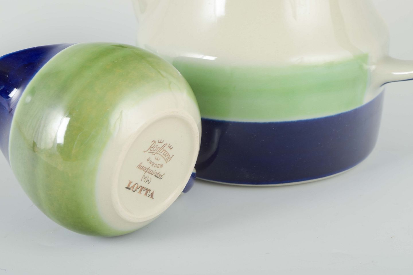 Rörstrand is one of Sweden’s oldest and most prestigious porcelain and faience manufacturers, founded in 1726 in Stockholm. The “Lotta” series is an example of the factory’s retro-inspired design from the 1970s and 80s, characterized by colorful and simple decoration that reflects the Nordic design language of the period. Today, the series is sought after by collectors of Scandinavian retro design.