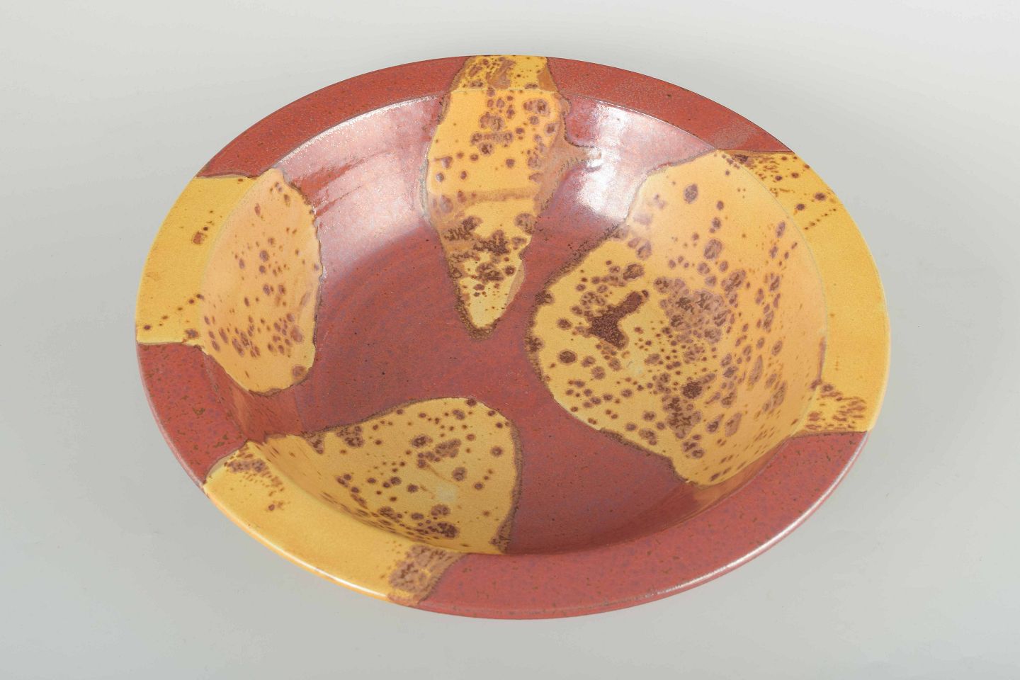 Wheel-thrown stoneware bowl with reddish-brown base glaze and decorative yellow speckled patches in an organic, abstract pattern. Indistinctly signed to the underside.