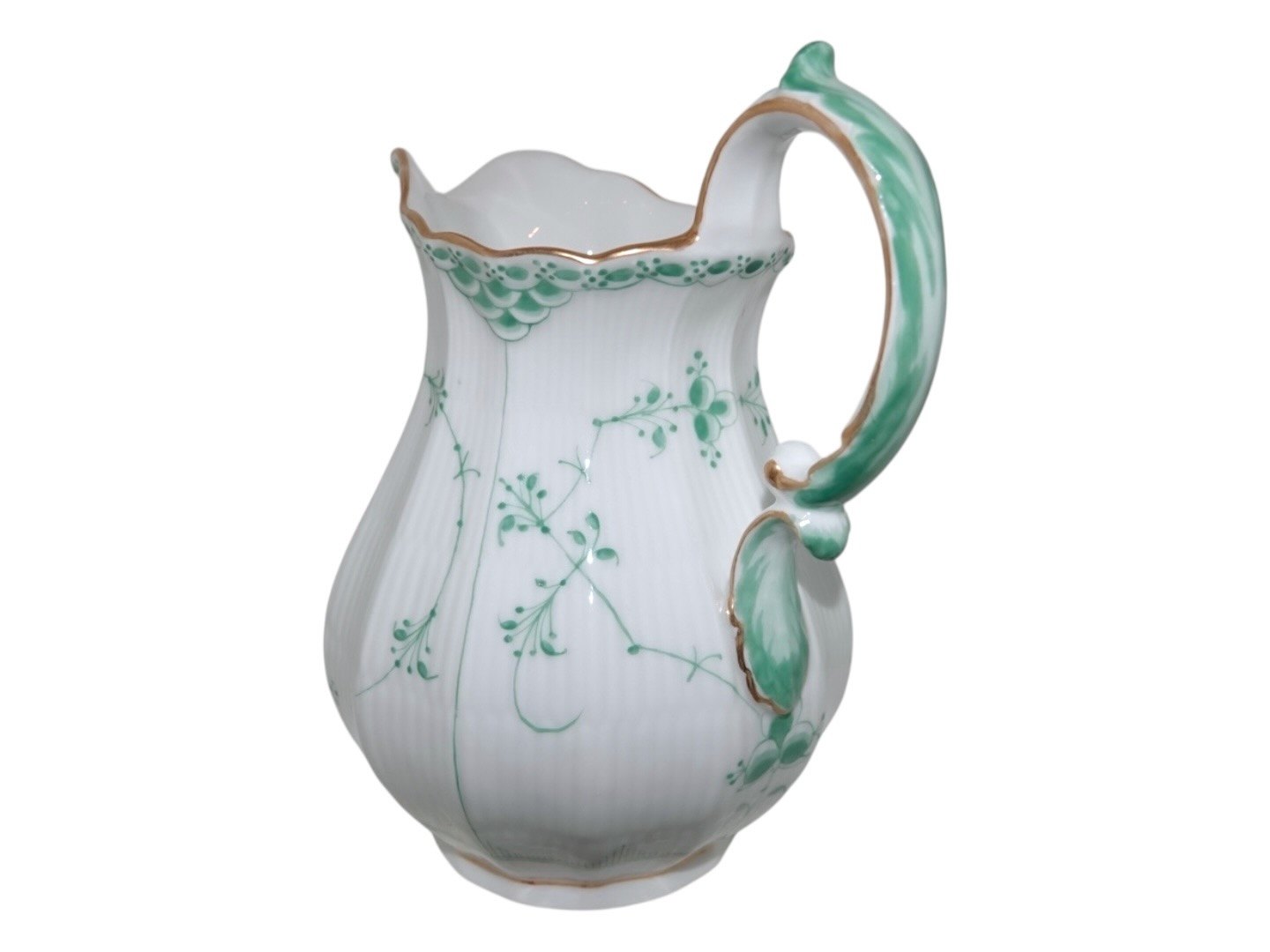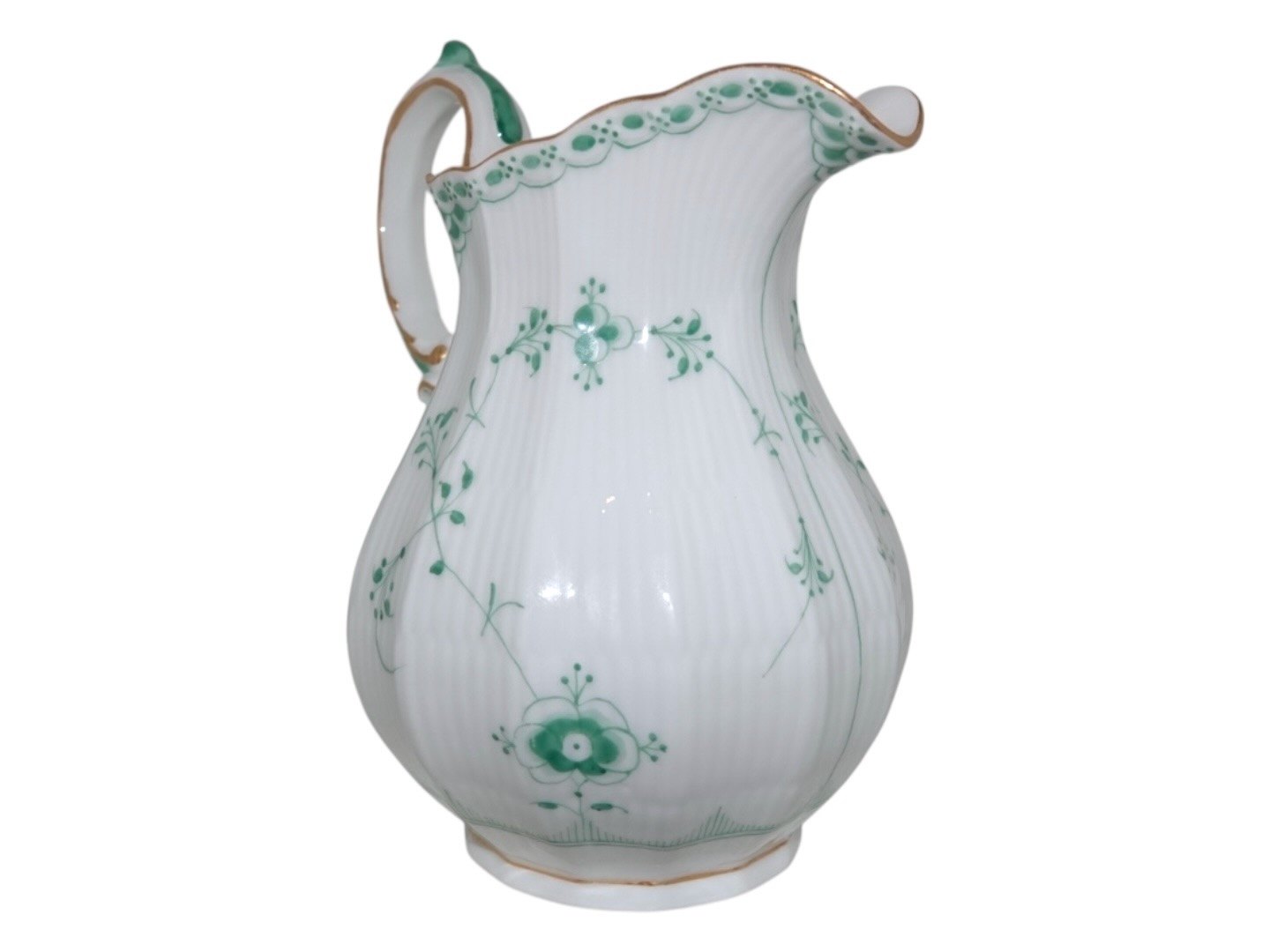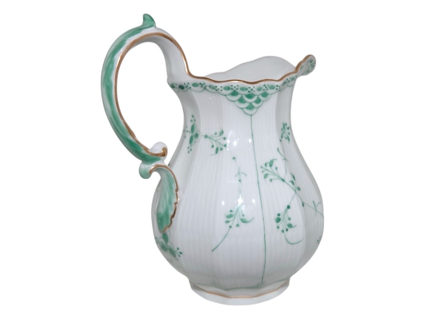 Royal Copenhagen Green Fluted Half Lace with gold trim, milk pitcher.
