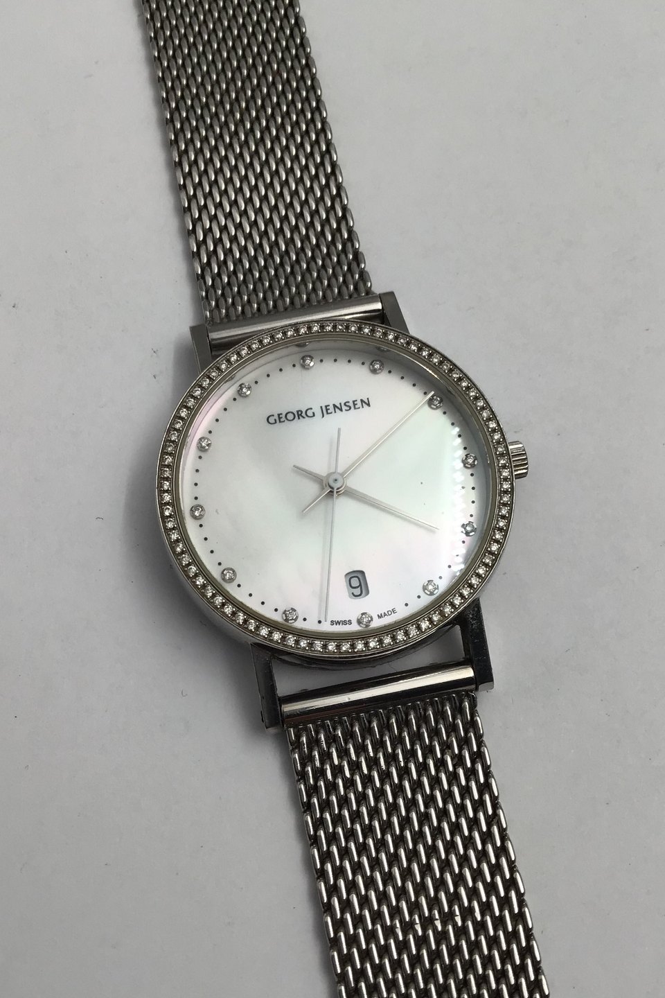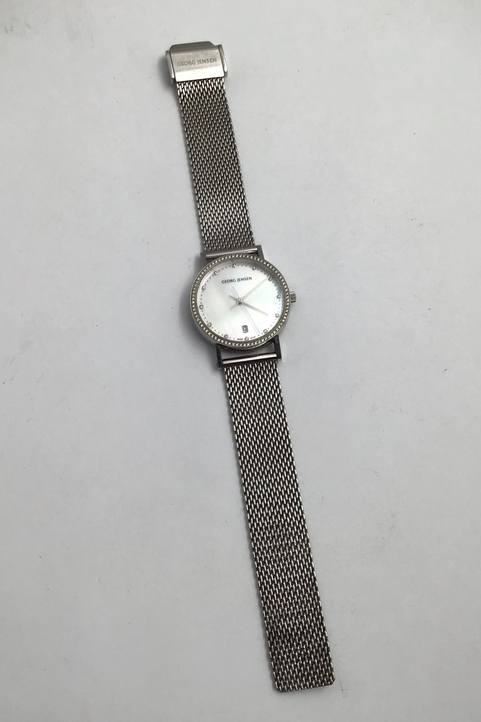 Georg Jensen Steel Ladies Wrist Watch No. 321 Henning Koppel Mother of Pearl Dial, Diamond Bezel, Saphire Glass, Mesh Band