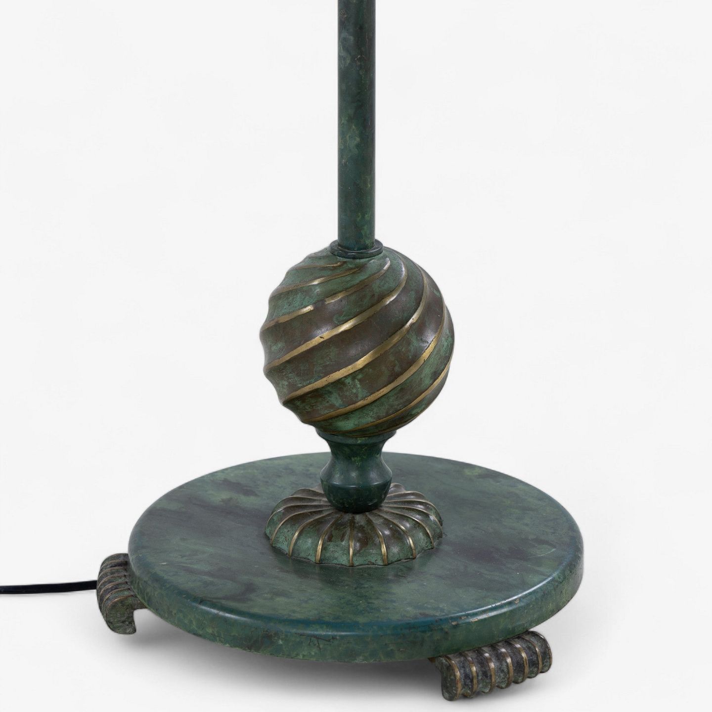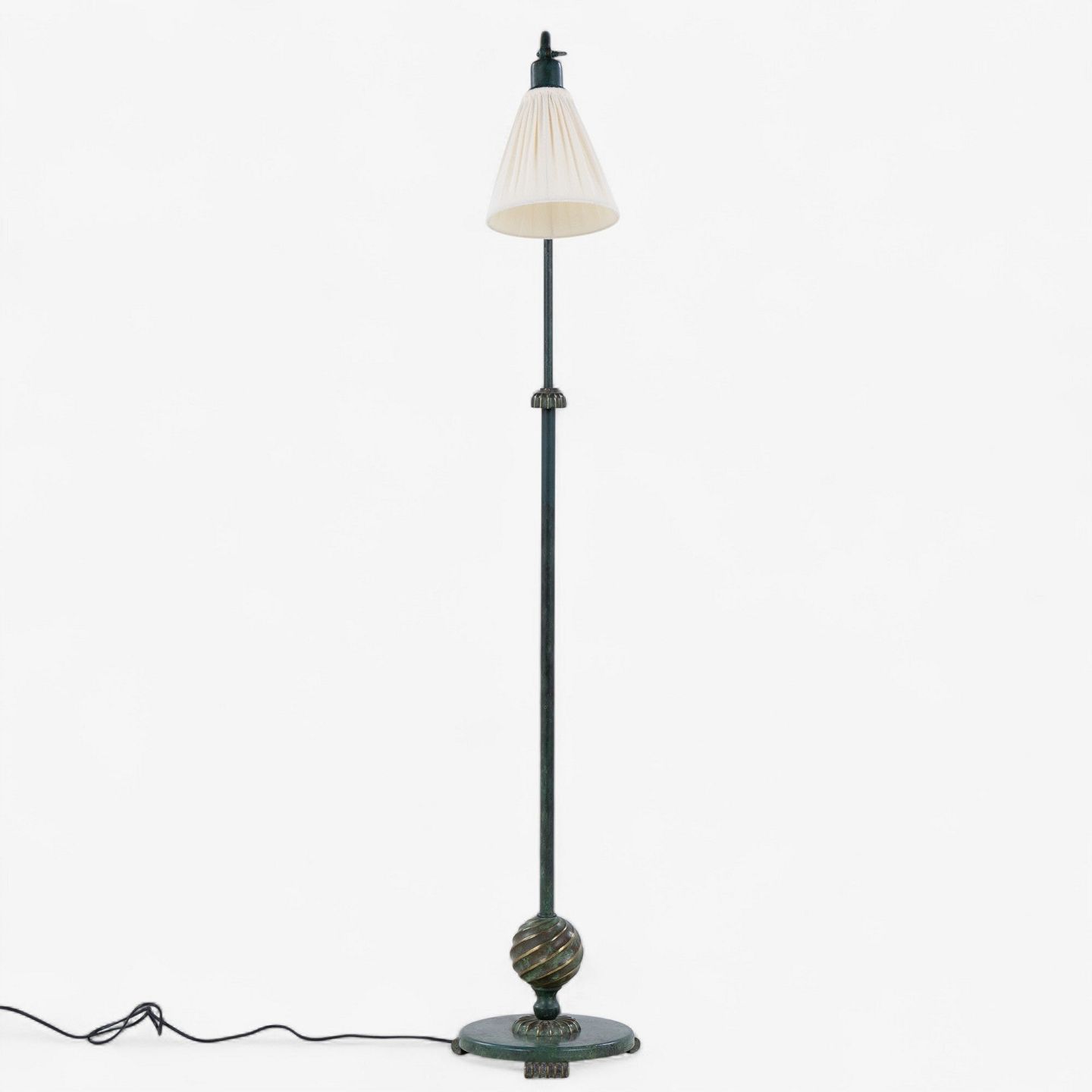 Sculptural floor lamp in patinated bronze with height adjustment and white fabric shade. From 1930.