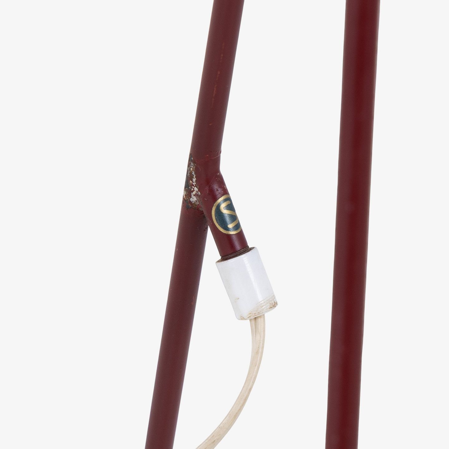 Model 569 - 'Giraffen' floor lamp with a frame in patinated red lacquered metal and a white fabric shade.