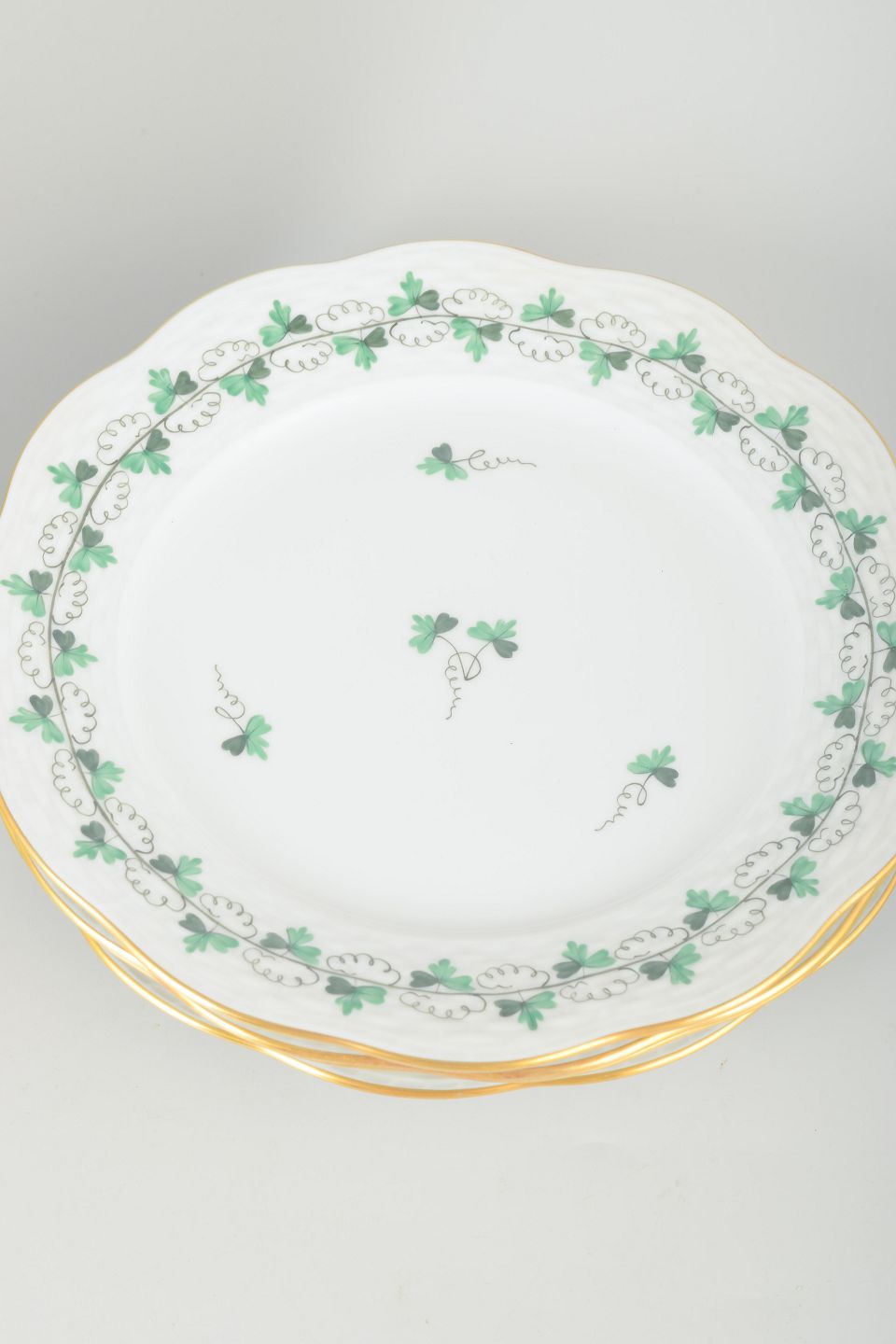 Set of six porcelain plates with hand-painted green leaf decoration and gilt rims. Classic form with scalloped edge and elegant decoration.