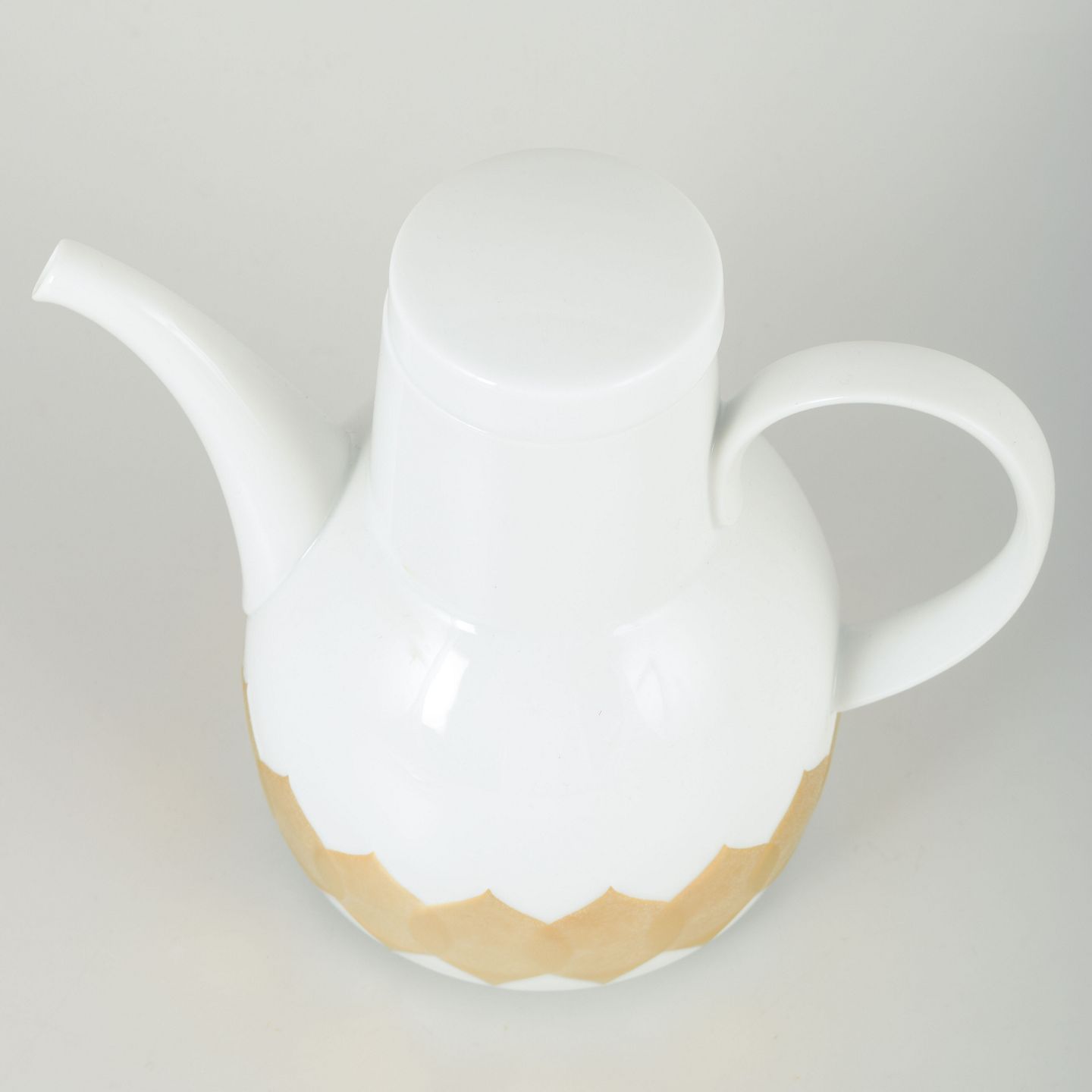 Elegant porcelain coffee pot with white glaze and geometric gold décor around the body. A classic design from Rosenthal’s Studio-Line series, known for combining functionality with modern design language.