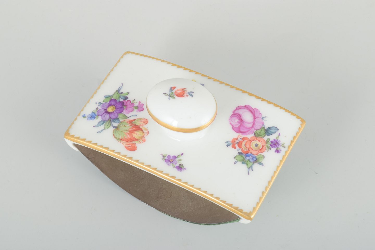 Porcelain blotter decorated with hand-painted flowers in the classic “Saxon Flower” pattern, gilded rim, and knob-shaped handle.
