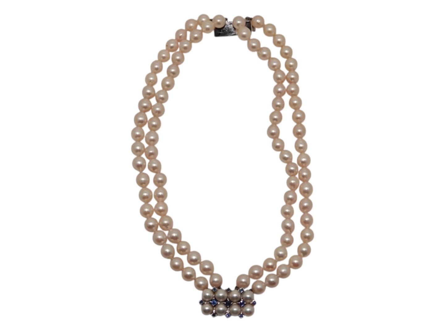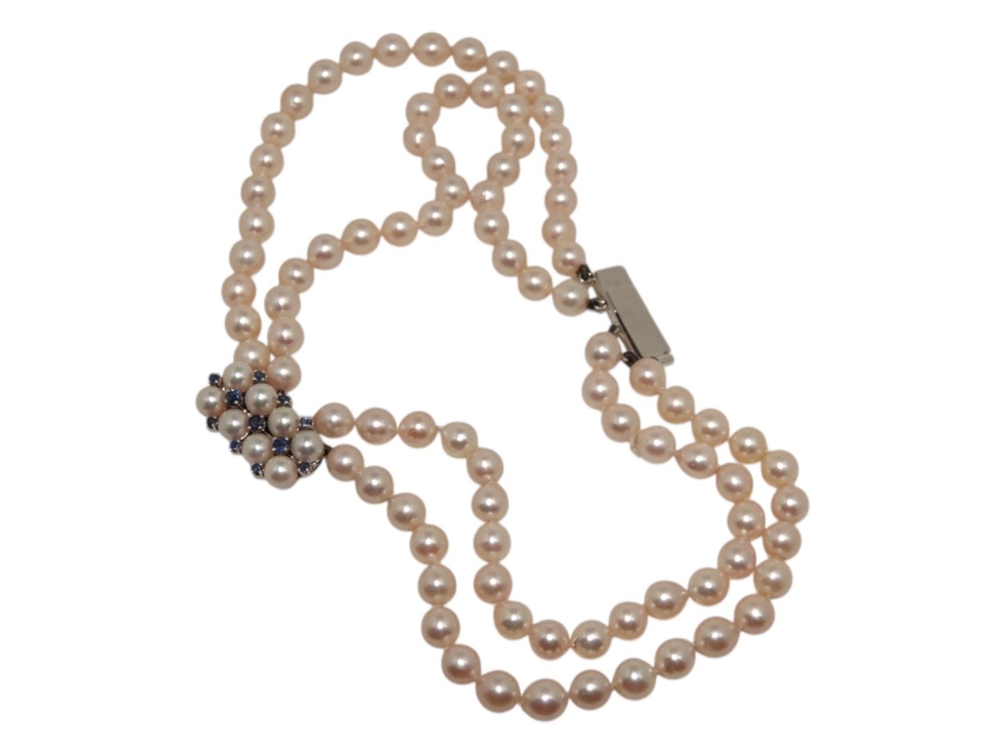 Double row pink Akoya pearl bracelet with 14 carat white gold pendant with sapphires.