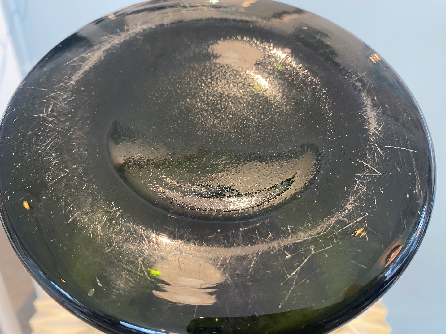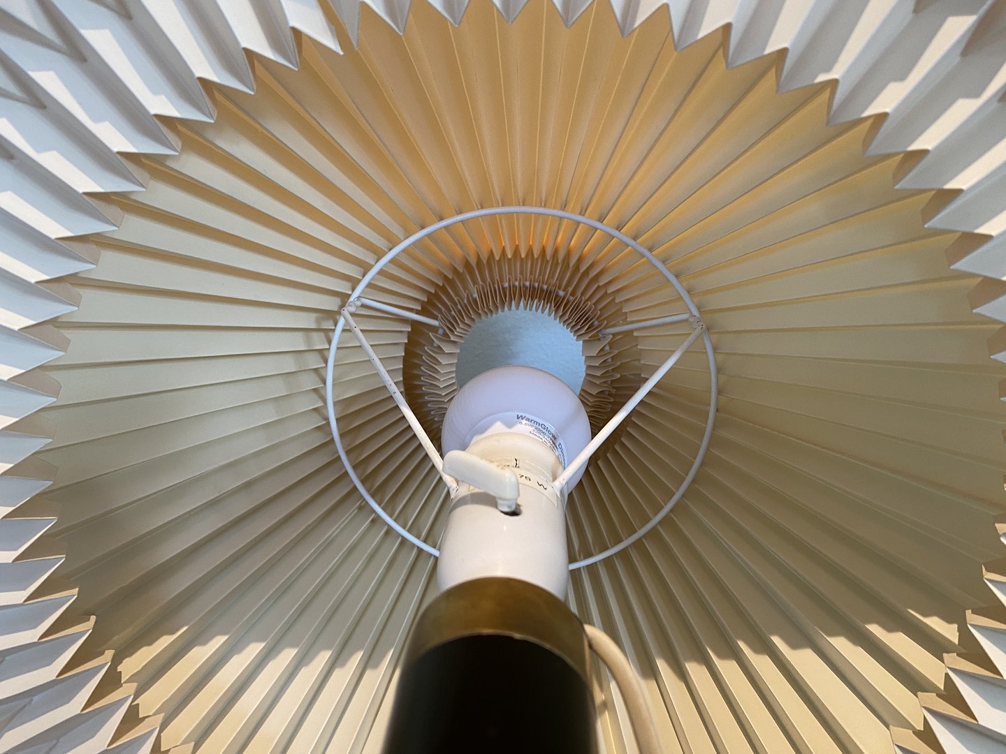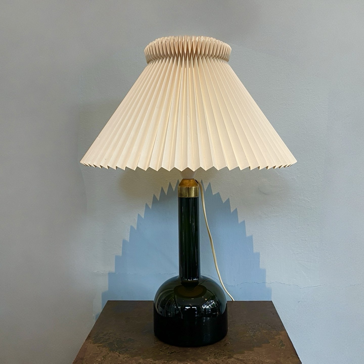 Rare Le Klint table lamp with lamp base of dark green glass mounted with pleated shade. Shade appears nice but with a few holes which are not visible when the shade is on. H. 56.5 cm, lamp base 14.5 cm.