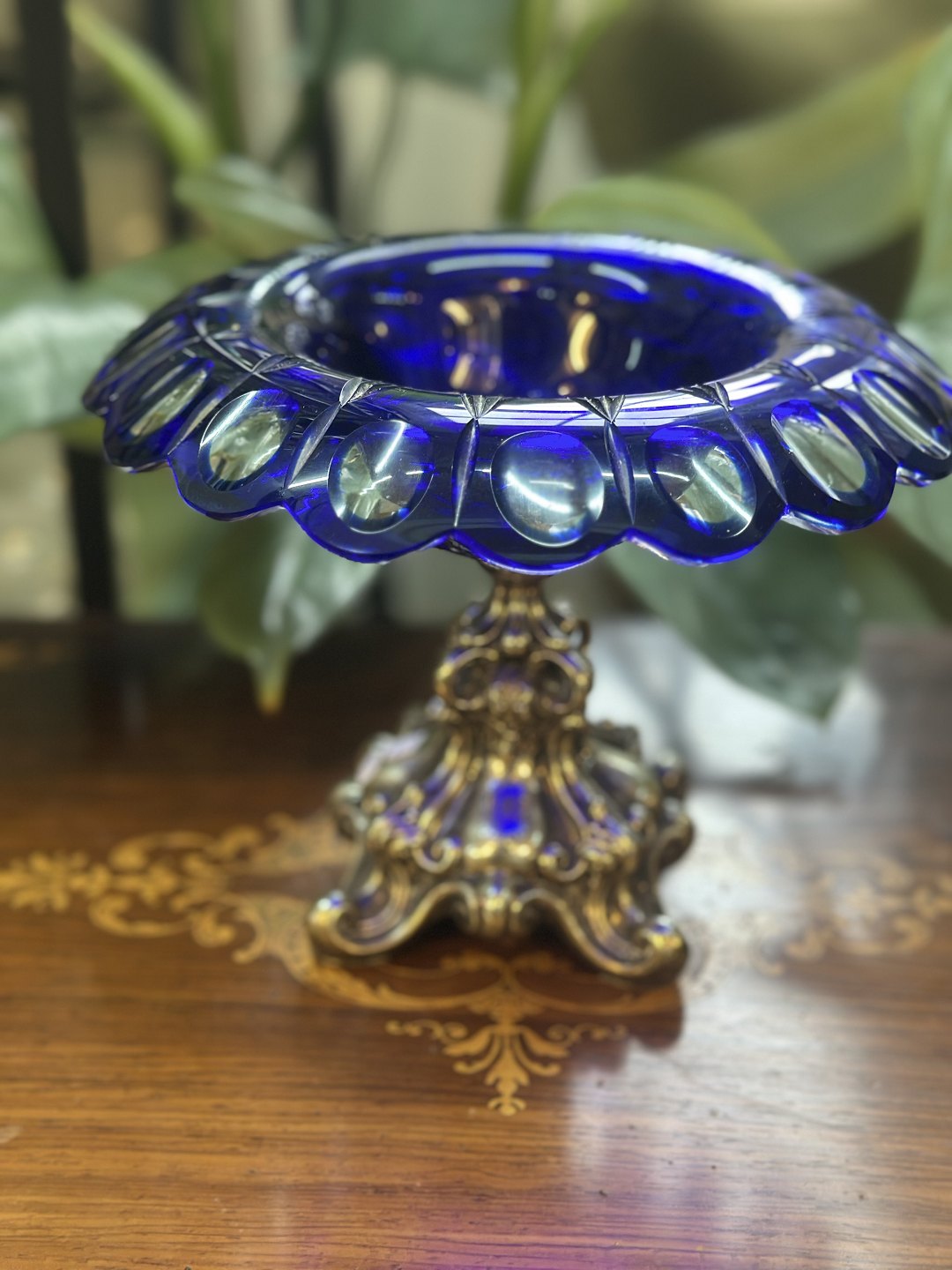 Bohemia Round bowl with wavy edge and large opening mounted on an ornamented metal base in Baroque style. Silver plated with decorated acanthus leaves and curved feet
