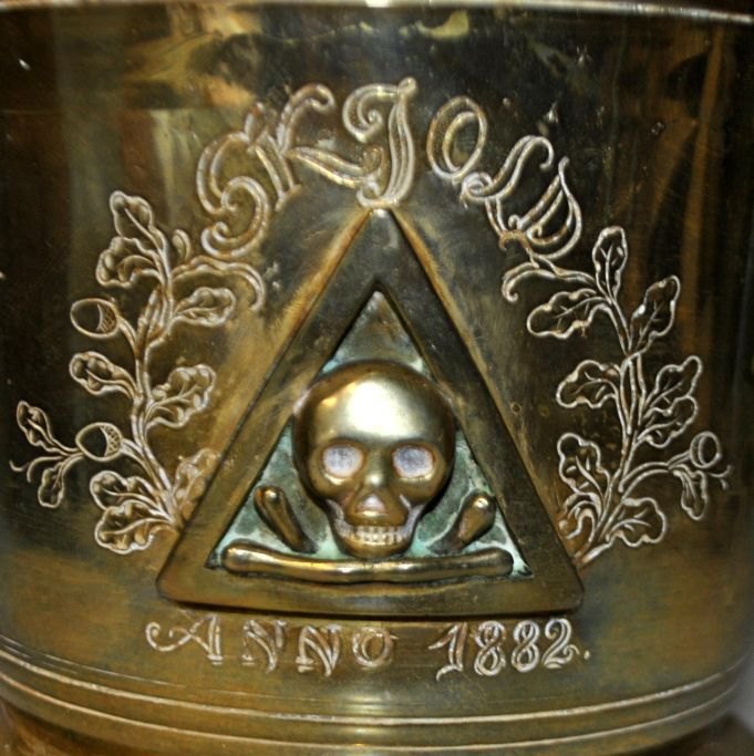 Large brass pharmacist mortar from Svane Apoteket in Randers, 1882. Denmark. With pestle. The side is decorated with a triangle, in which there is a skull with crossed bones. With engraved decoration and the name: Skjold anno. 1882. Height.: 15 cm. Dia opening: 17 cm. Length pestle: 25.5 cm.
