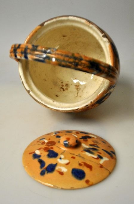 Small Danish maternity bucket, 19th century. Red clay with glaze in blue, white and red colors. With handle and lid. H: 21 cm.
