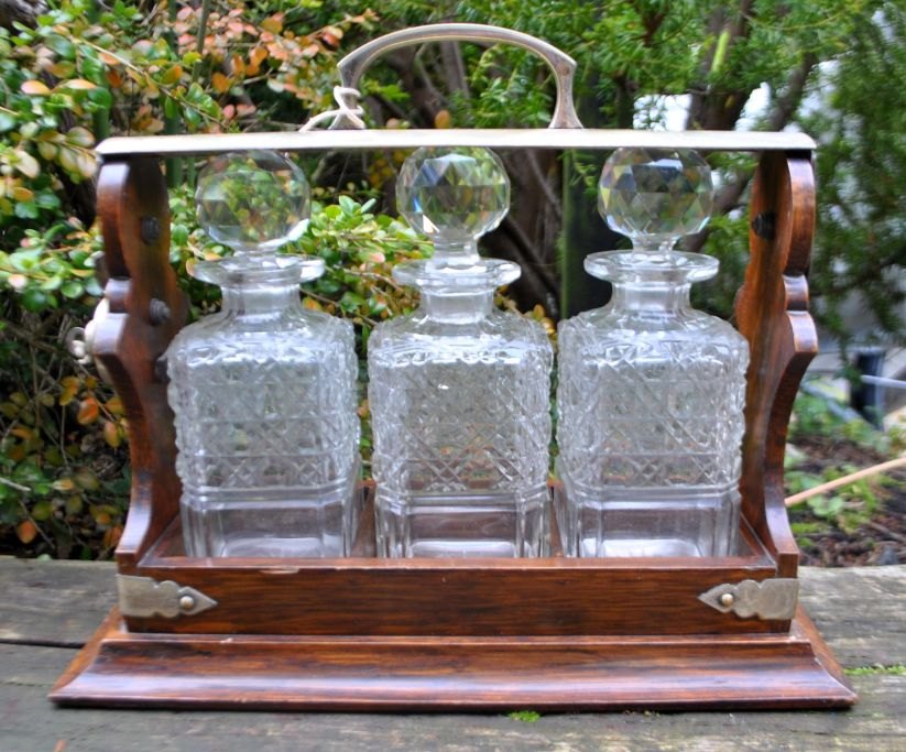 Tantalus of oak with three crystal decanters with stoppers. England. 19th century.