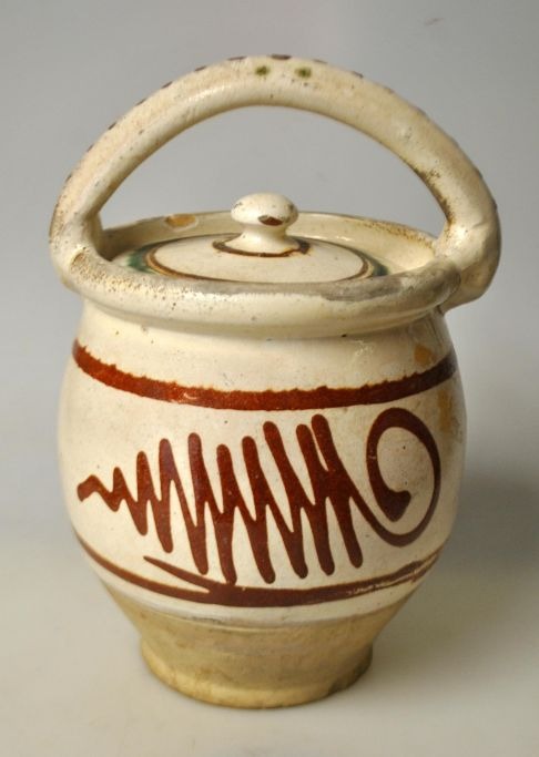Antique Danish maternity pot in glazed red clay, 19th century. With white underglaze and red and green overglazes. H.: 21 cm.