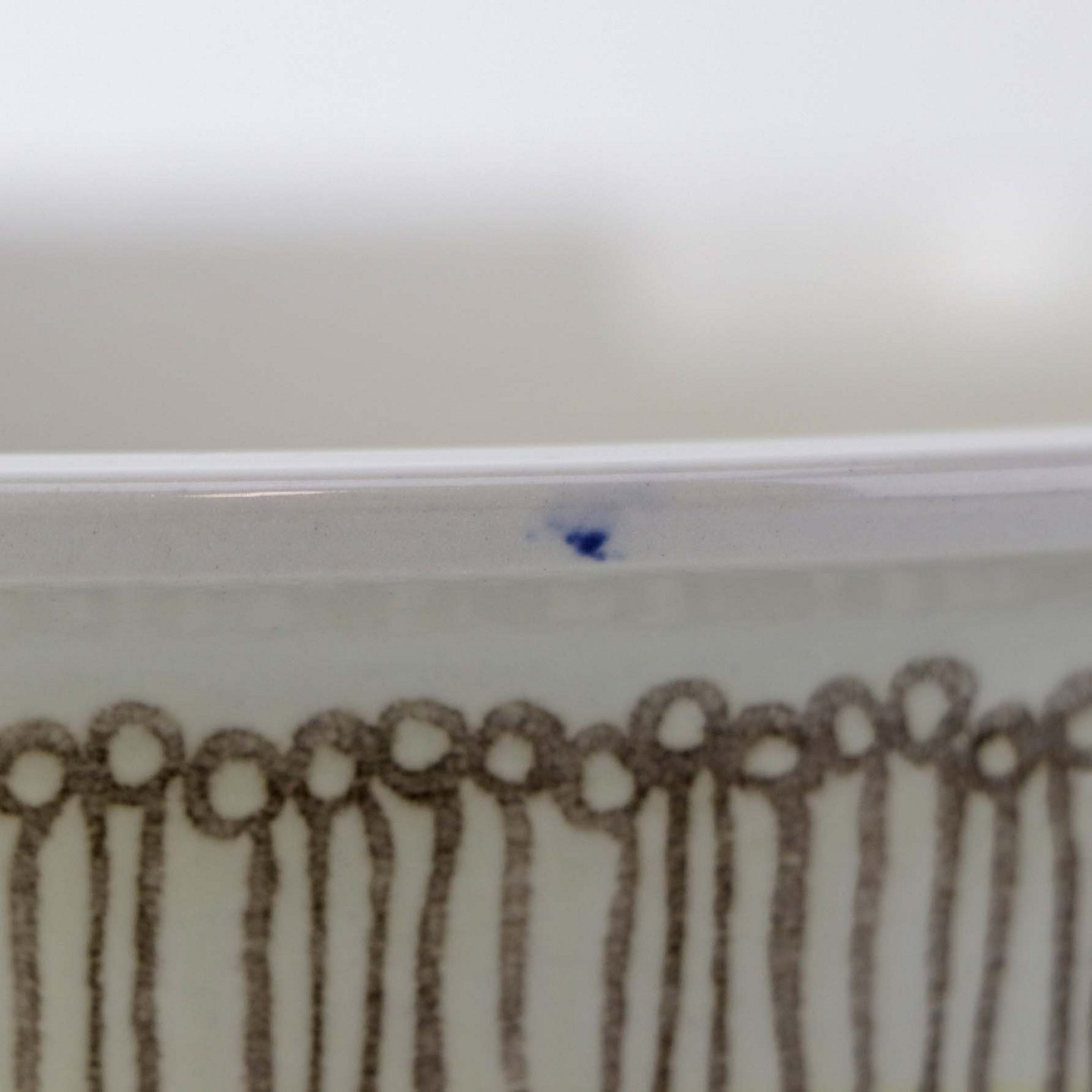 Fremstår med let ridset bund og en blå plet under glasuren på sidenkanten af skålen.