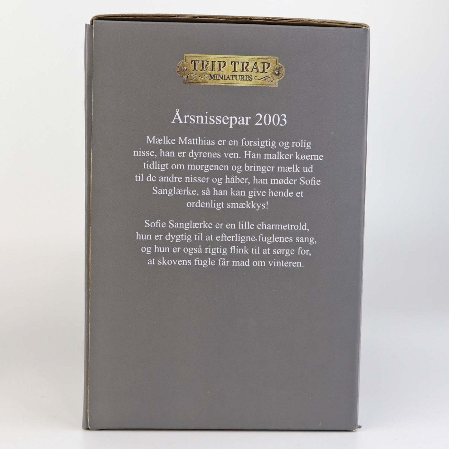 Text available in Danish: Figursæt med motiv Mathias og Sofie, som er årsnissepar fra år 2003 fra serien Klarborg jul. Figurene kommer med original boks.