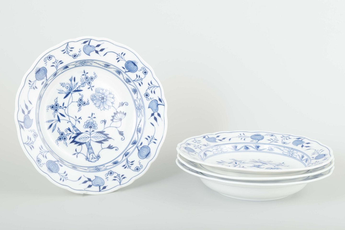 Four hand-painted porcelain soup plates with underglaze blue “Blue Onion” decoration, scalloped rims and refined floral detailing.