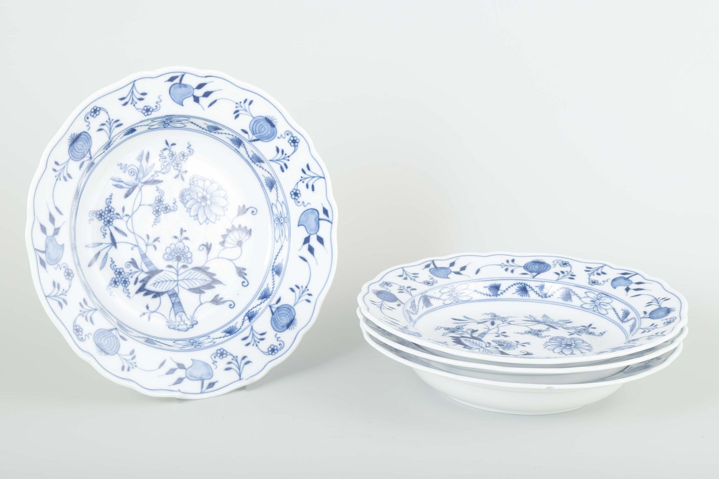 Four hand-painted porcelain soup plates with underglaze blue “Blue Onion” decoration, scalloped rims and refined floral detailing.