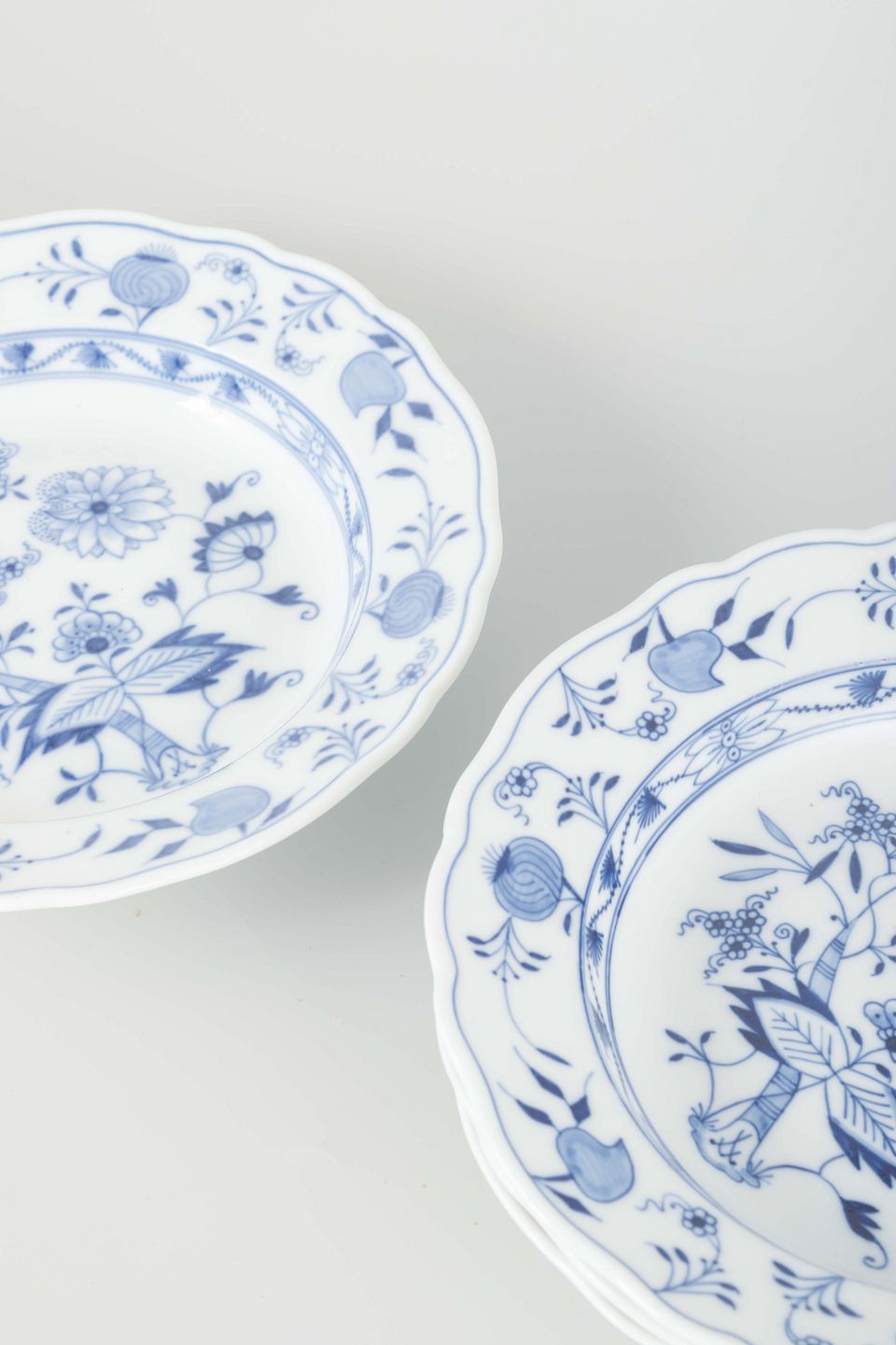 Four hand-painted porcelain soup plates with underglaze blue “Blue Onion” decoration, scalloped rims and refined floral detailing.