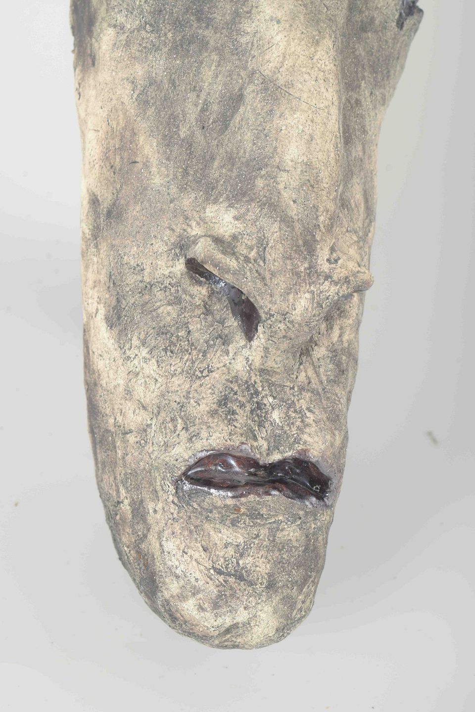 Unique hand-modelled stoneware sculpture with raw grey surface, decorated with a blue glazed band and white horn-like forms. An expressive, figurative work with strong artistic character.