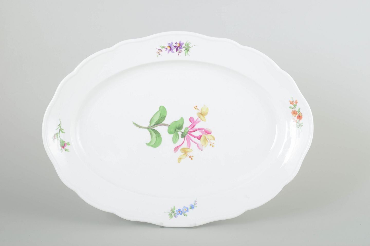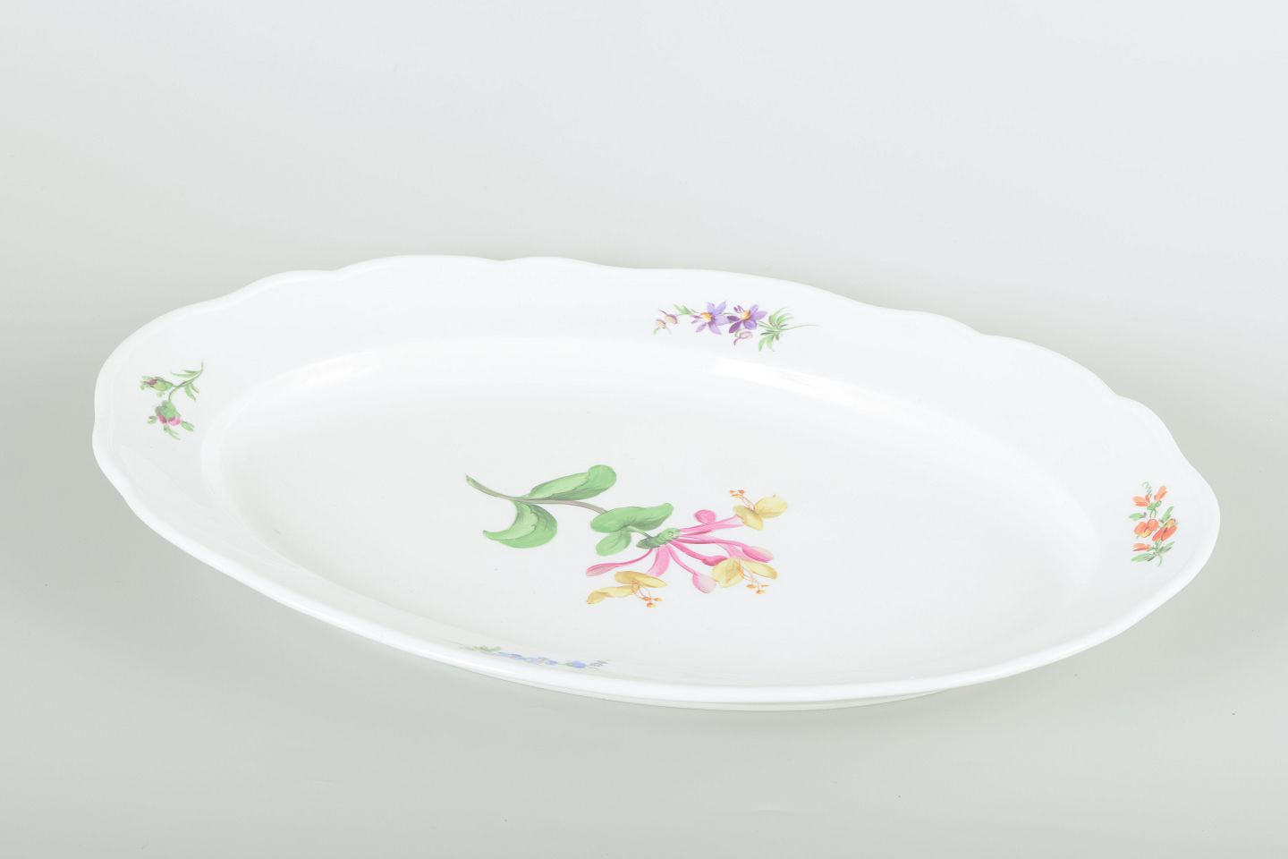 Elegant porcelain serving dish, hand-painted with multicoloured floral decorations. Classic scalloped rim with relief and refined detailing.