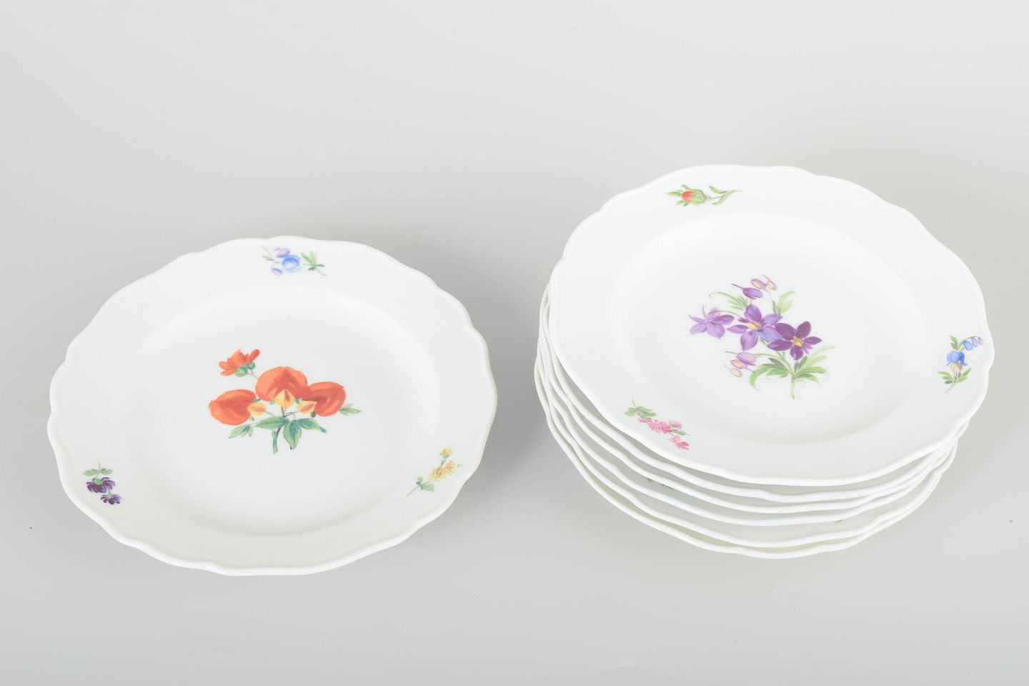 Seven porcelain plates, hand-painted with multicoloured floral decorations. Classic scalloped rim with relief and delicate detailing.