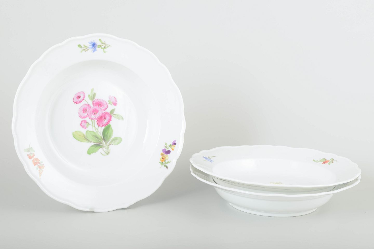 Three porcelain soup plates, hand-painted with multicoloured floral decorations. Classic scalloped rim with relief and delicate detailing.