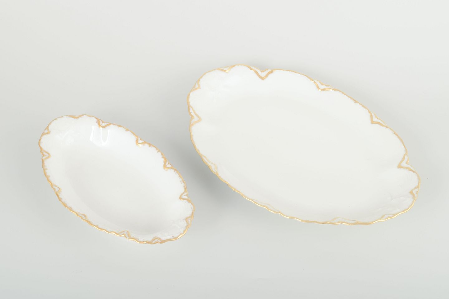 Elegant pair of oval porcelain dishes in a warm cream tone with hand-painted gold edging and gently scalloped forms. A fine example of classic French tableware with subtle Art Deco influence.
