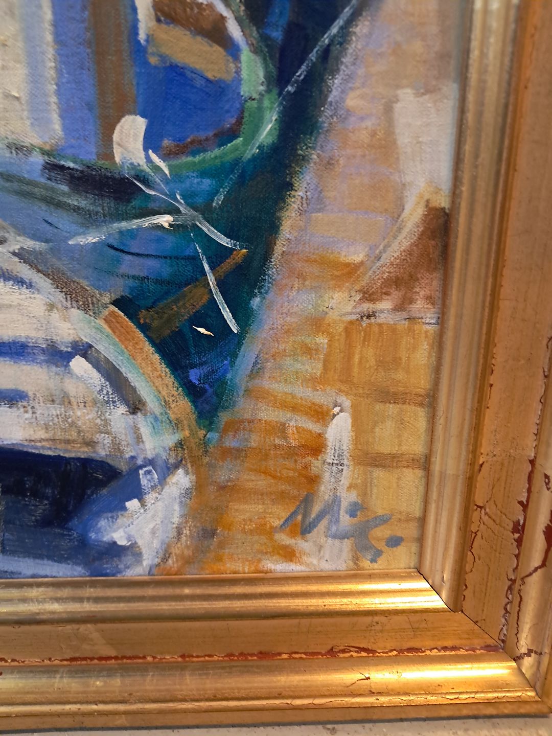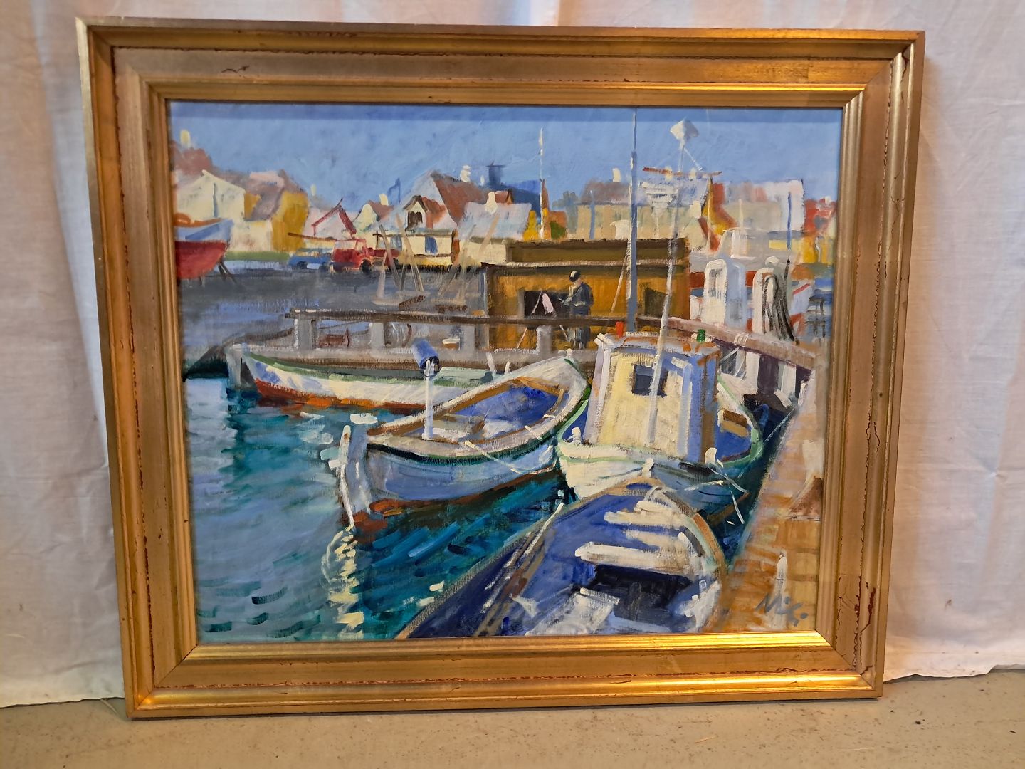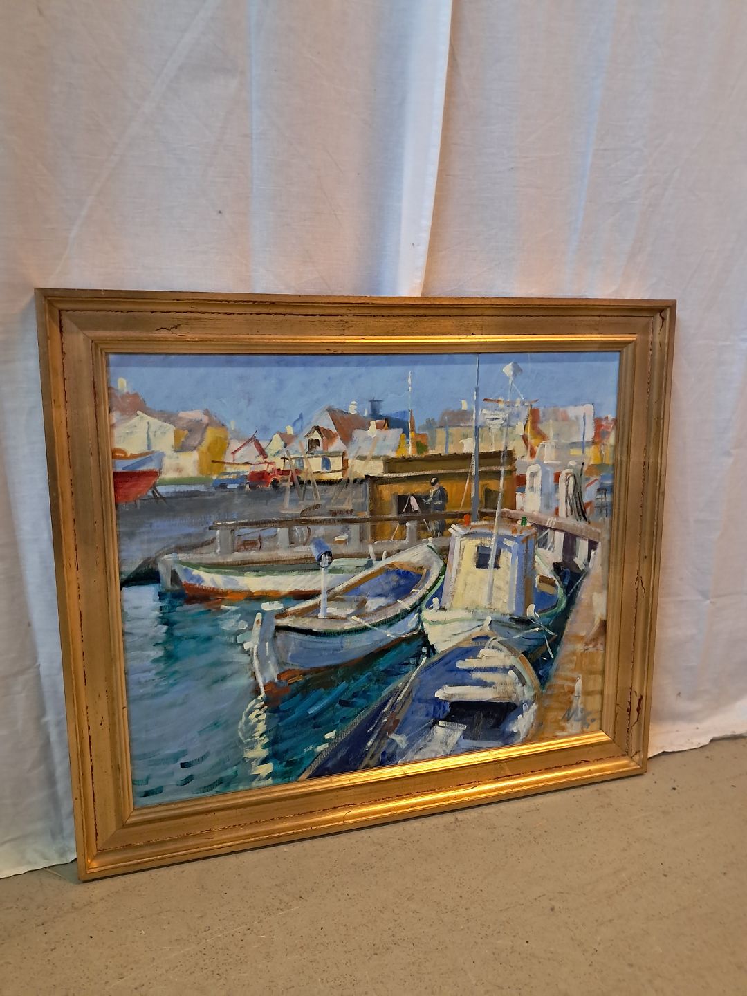 Maleri af Dragør havn i guldmalet ramme, af : Mogens Amdi Thorsen (1924-2016)