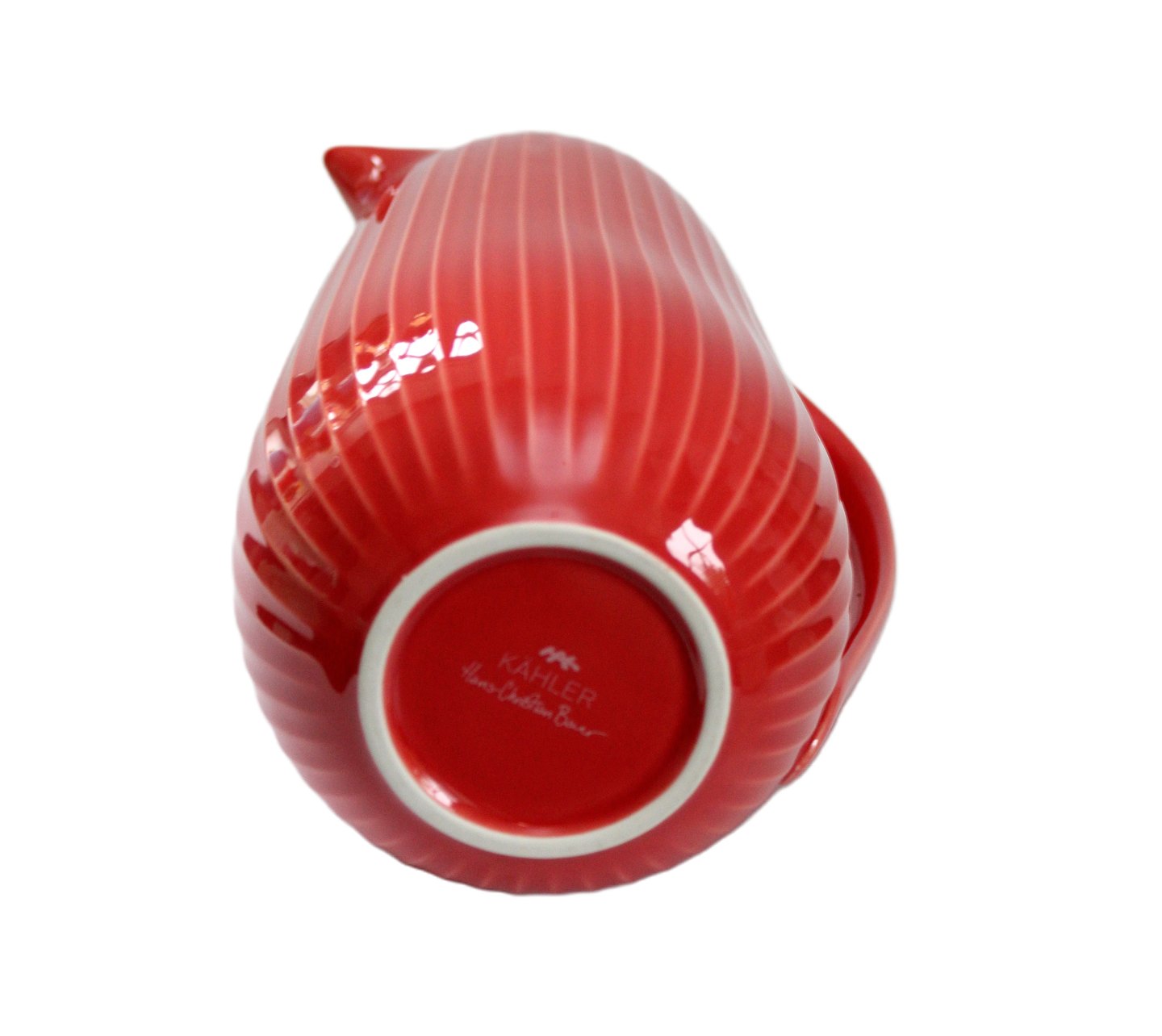 Text available in Danish: Kähler, Hammershøj Collection, Kande i superlækker rustrød farve. Designet af Hans Christian Bauer, industriel designer som har taget de karakteristiske Hammershøj riller op i nye design. Højde 22,5 cm. Længde 15 cm. Pris: 375 kr. stk. Lager: 1