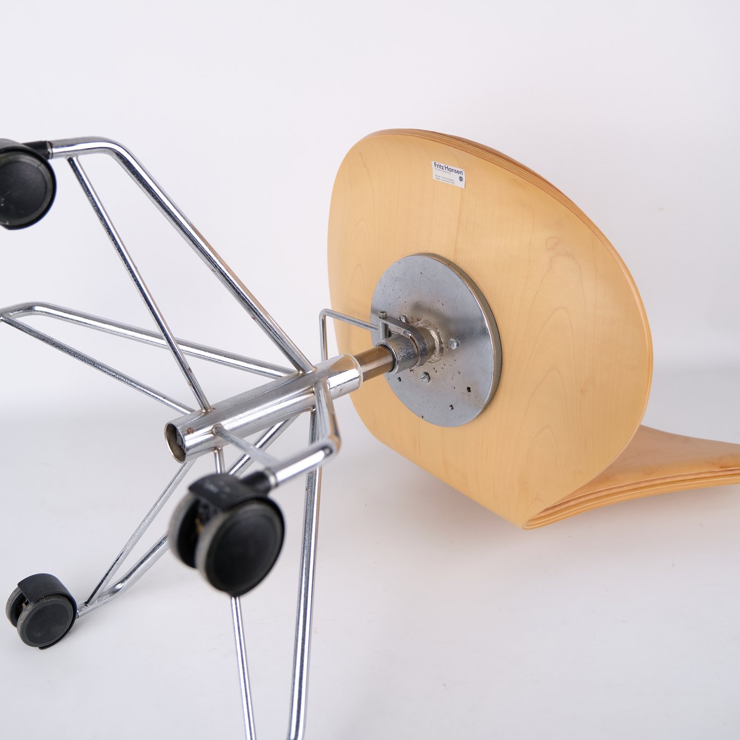 Arne Jacobsen Syver office chair, model 3117, for Fritz Hansen. Patinated natural leather and chrome frame with wheels. Classic Danish design.