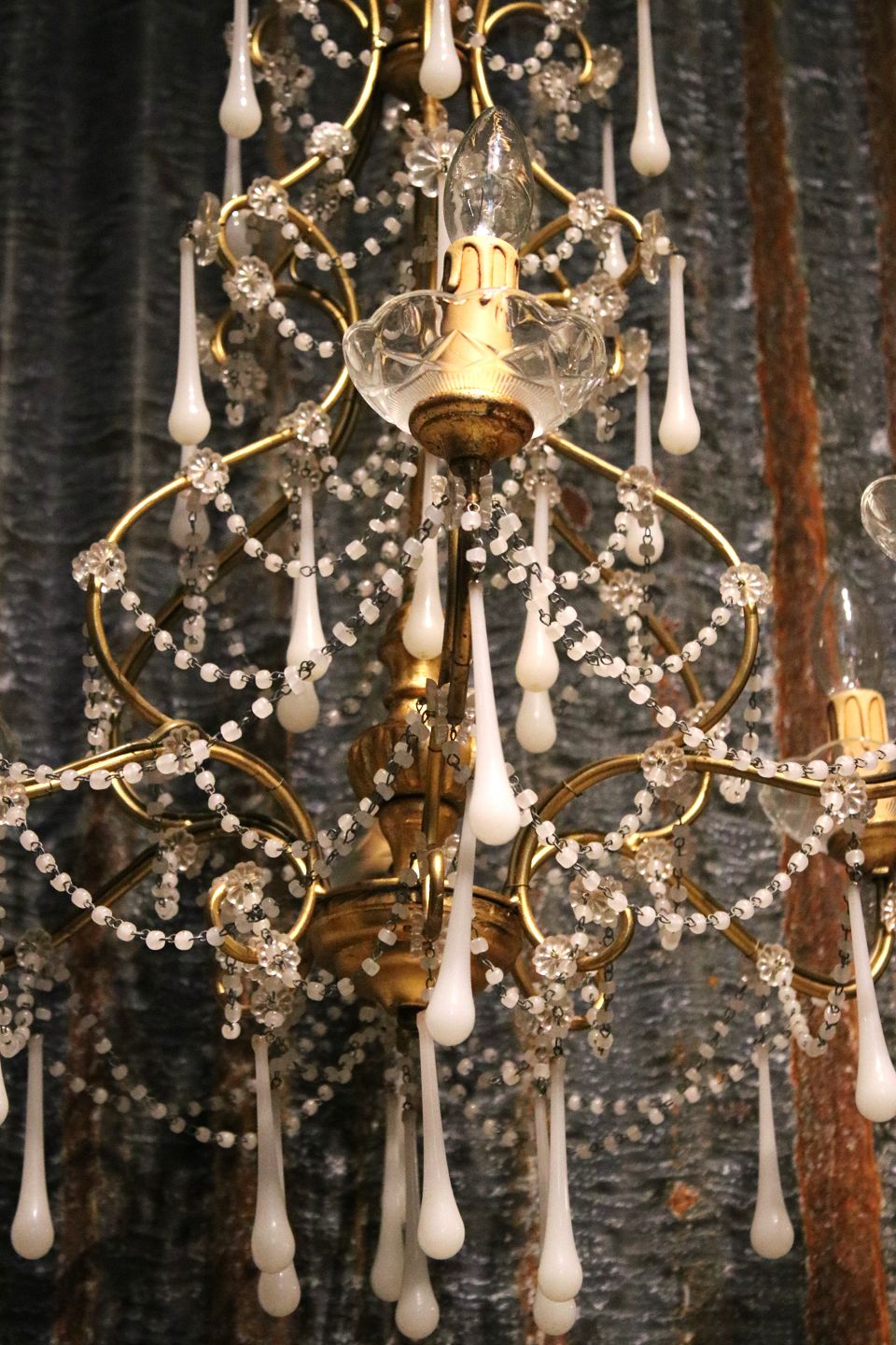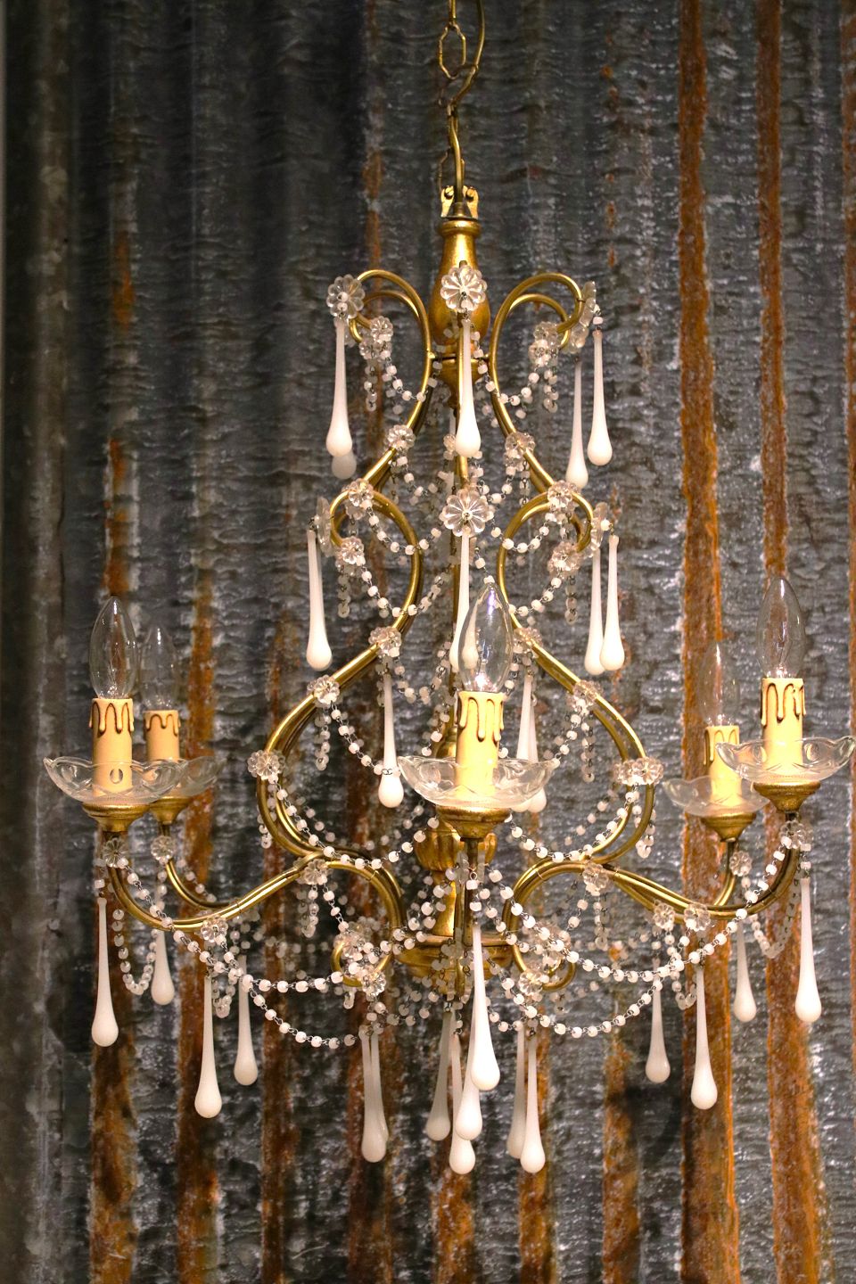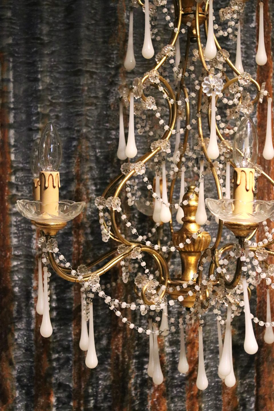 French chandelier in gilded metal and wood, decorated with white glass drops and chains.
