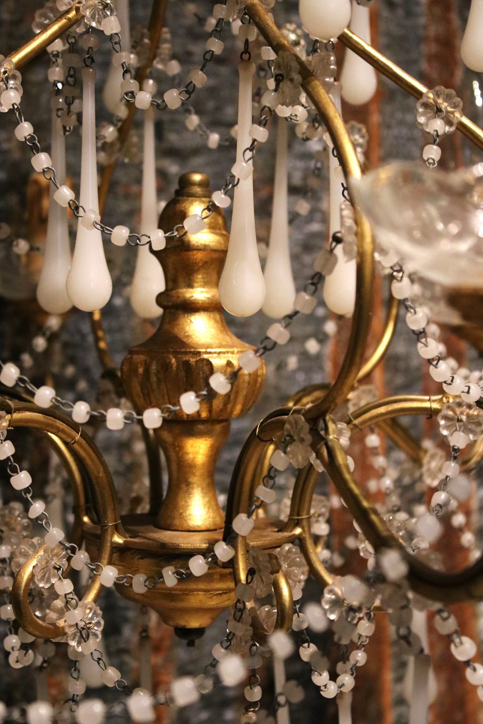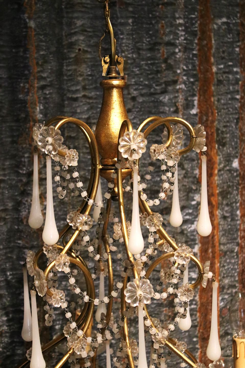 French chandelier in gilded metal and wood, decorated with white glass drops and chains...