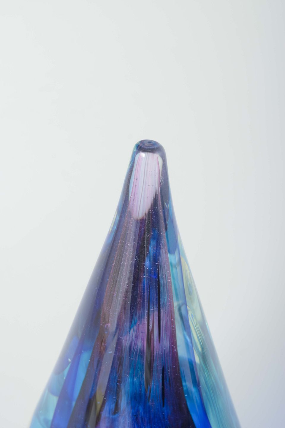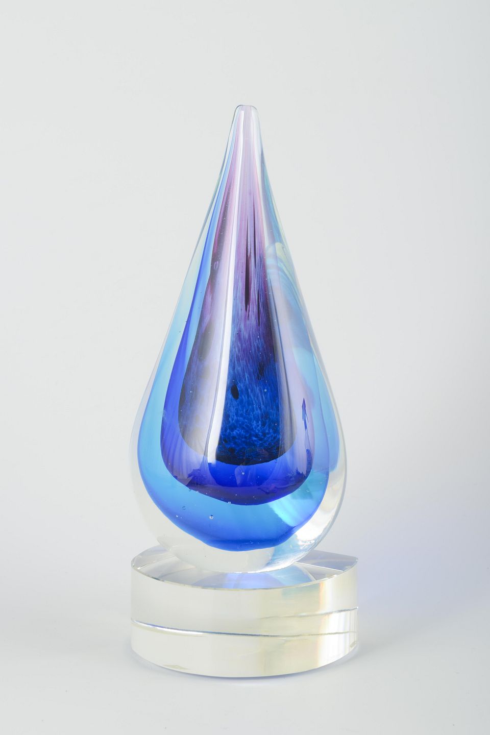 Handmade sculpture in clear and blue-violet glass, shaped as a drop with optical layers and an elegant pointed top. Mounted on a round clear-glass base.
