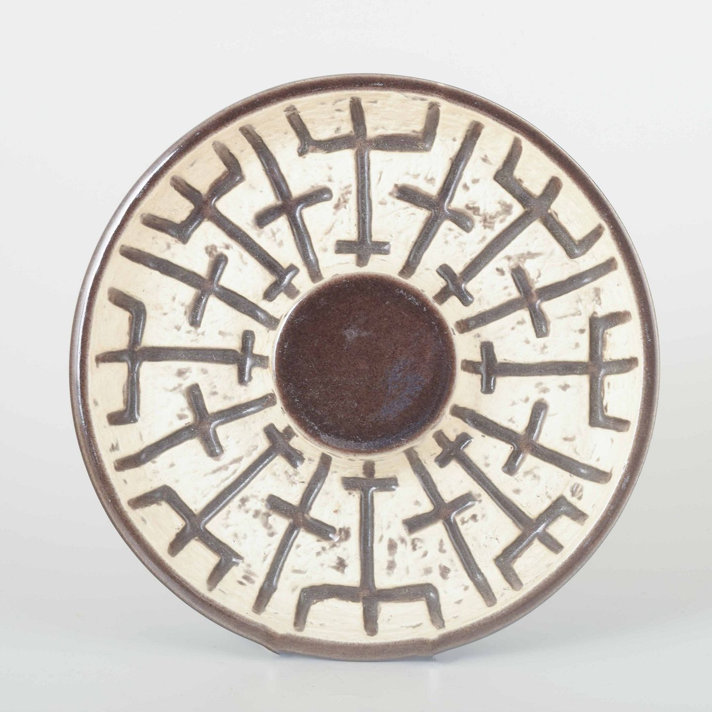 Decorative stoneware bowl with light glaze and brown relief ornamentation forming a bold, radial graphic pattern.