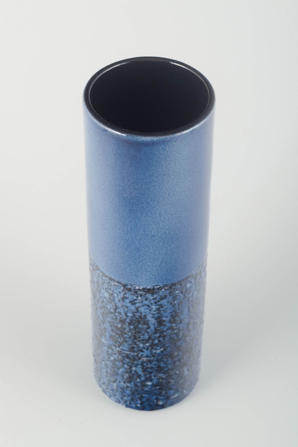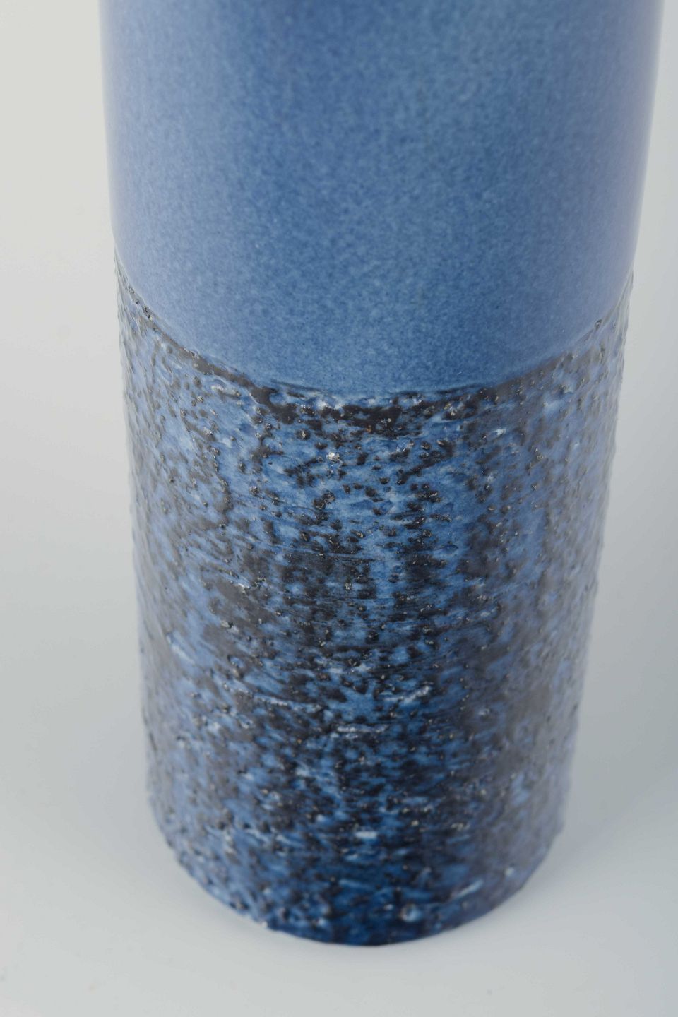 Elegant, slender stoneware vase with a two-part glaze – the upper section in glossy medium blue and the lower section with a darker crystalline texture in shades of blue and black.