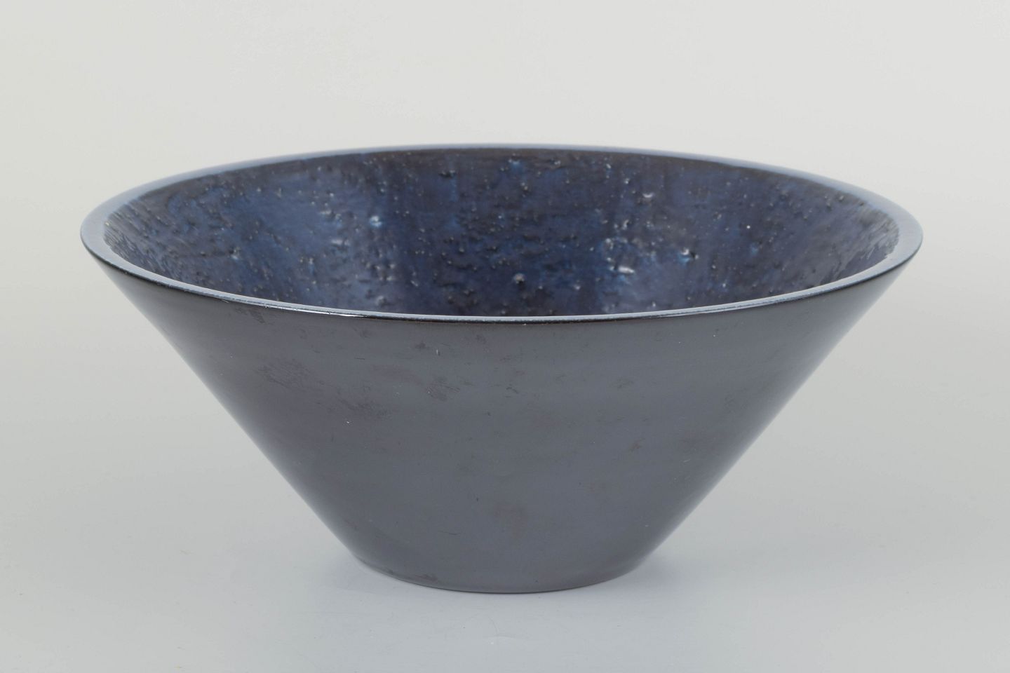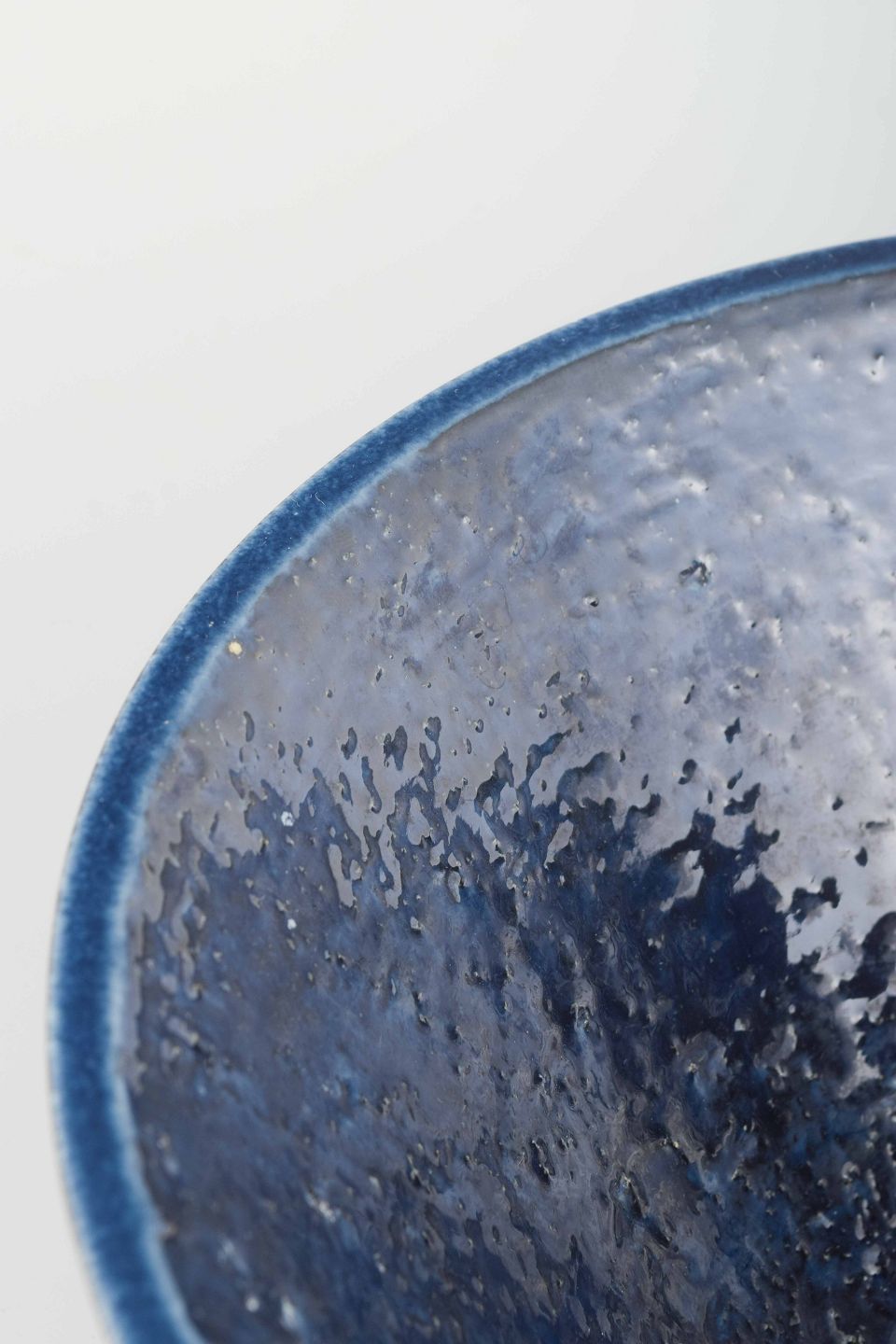 Conical stoneware bowl with deep dark blue glaze featuring a subtle crystalline surface texture.
