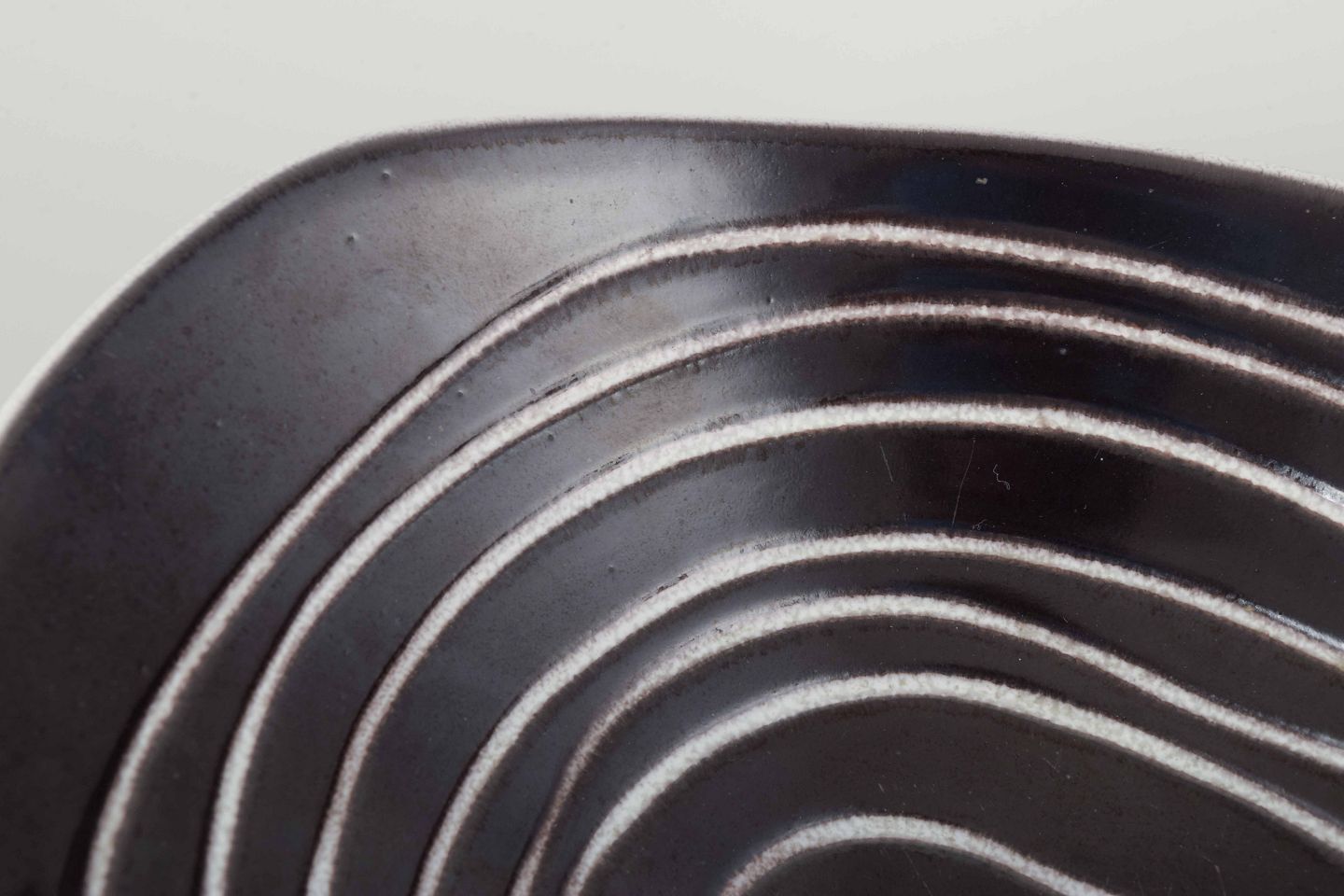 Asymmetrical faience bowl with white glaze on the exterior and dark grey glaze with white linear decoration on the interior.