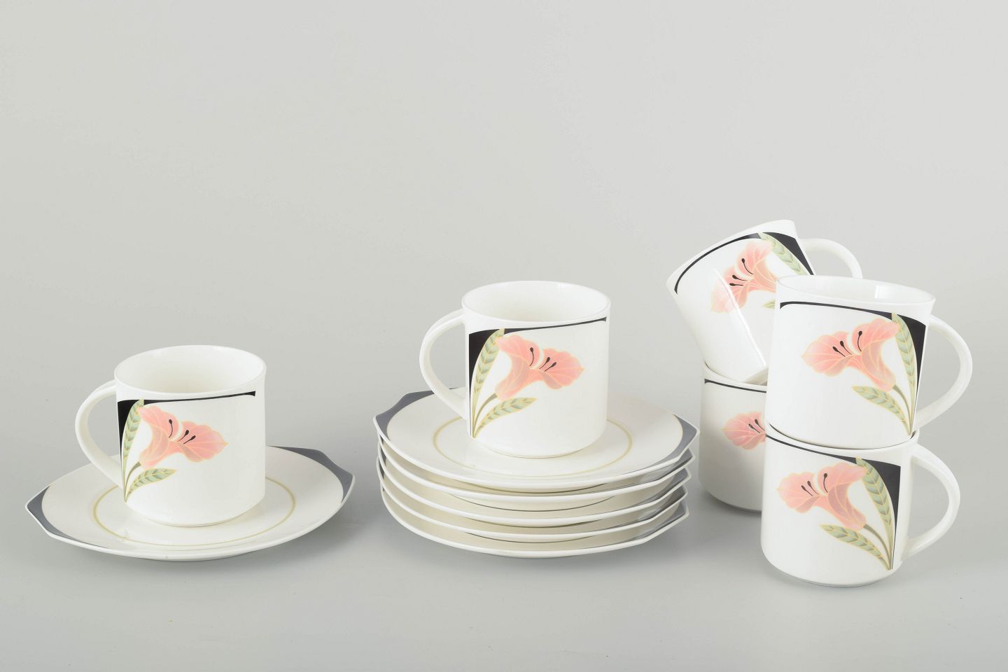 Six porcelain cups with matching saucers, decorated with hand-painted floral motifs in pink, green and black tones. The series combines clean lines and soft shapes with an elegant postmodern aesthetic.