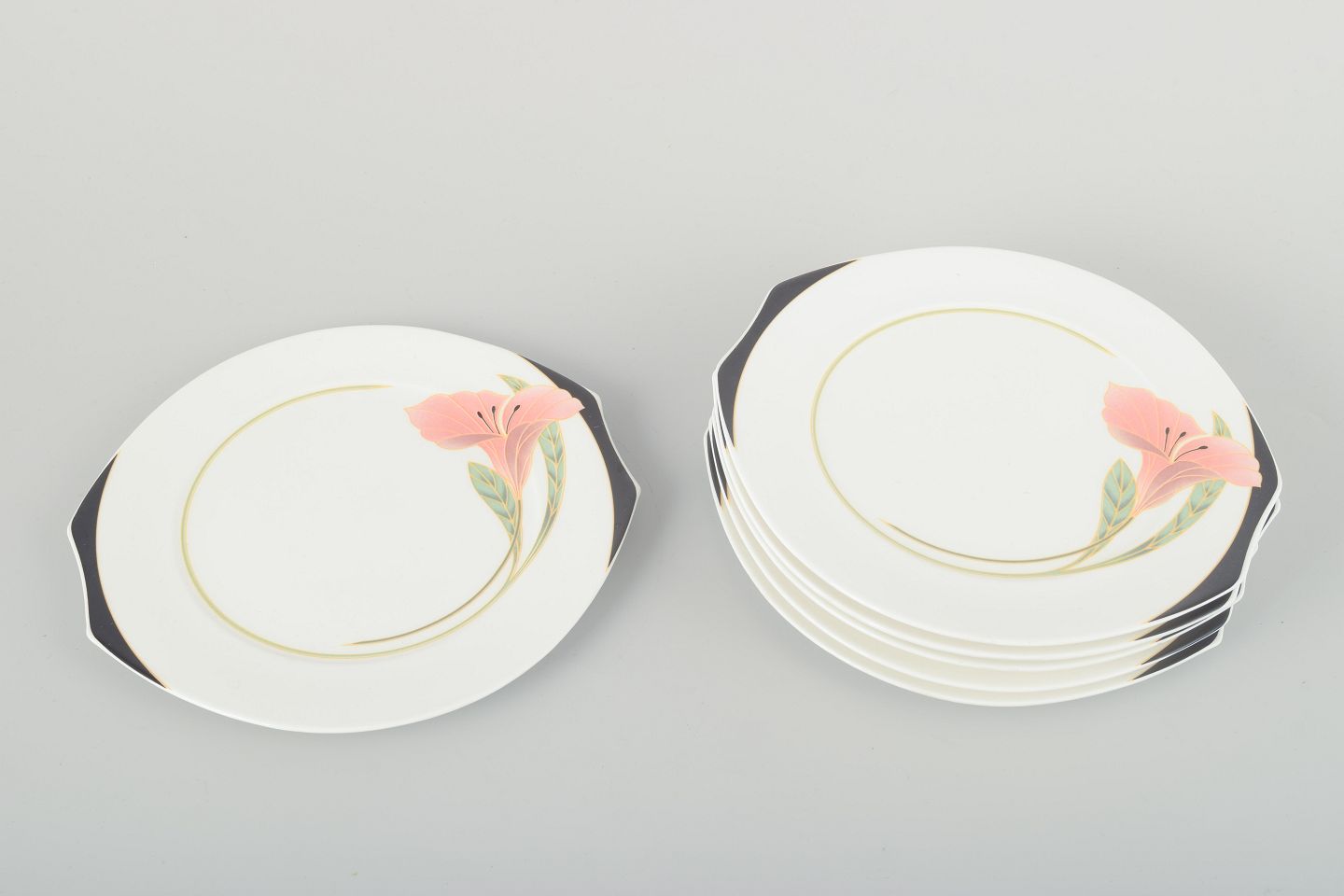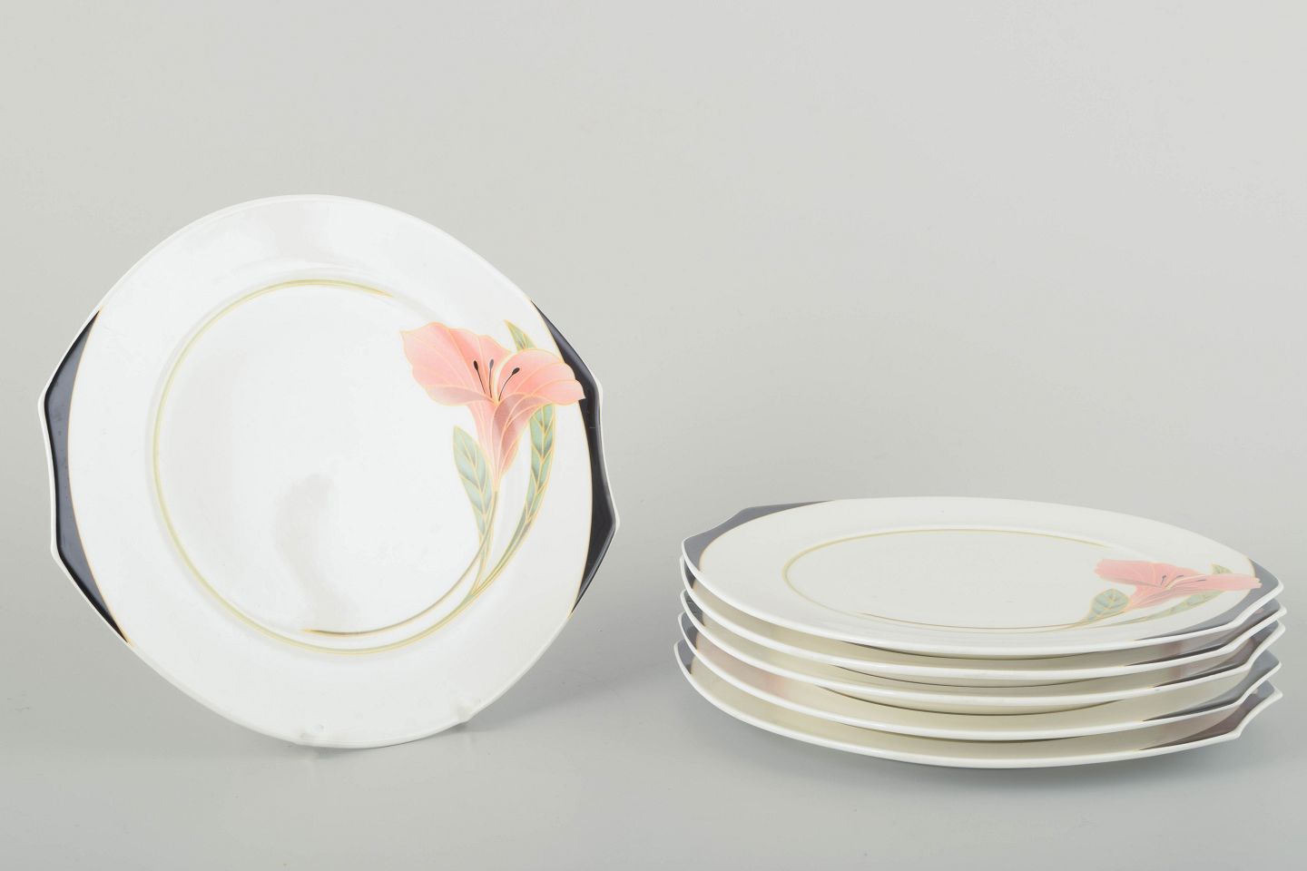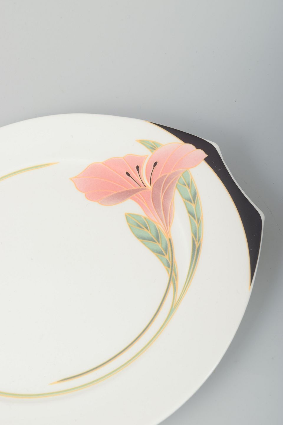 Six porcelain plates with hand-painted floral decoration in pink, green and black tones. The series combines soft lines and subtle asymmetry with an elegant postmodern design language.