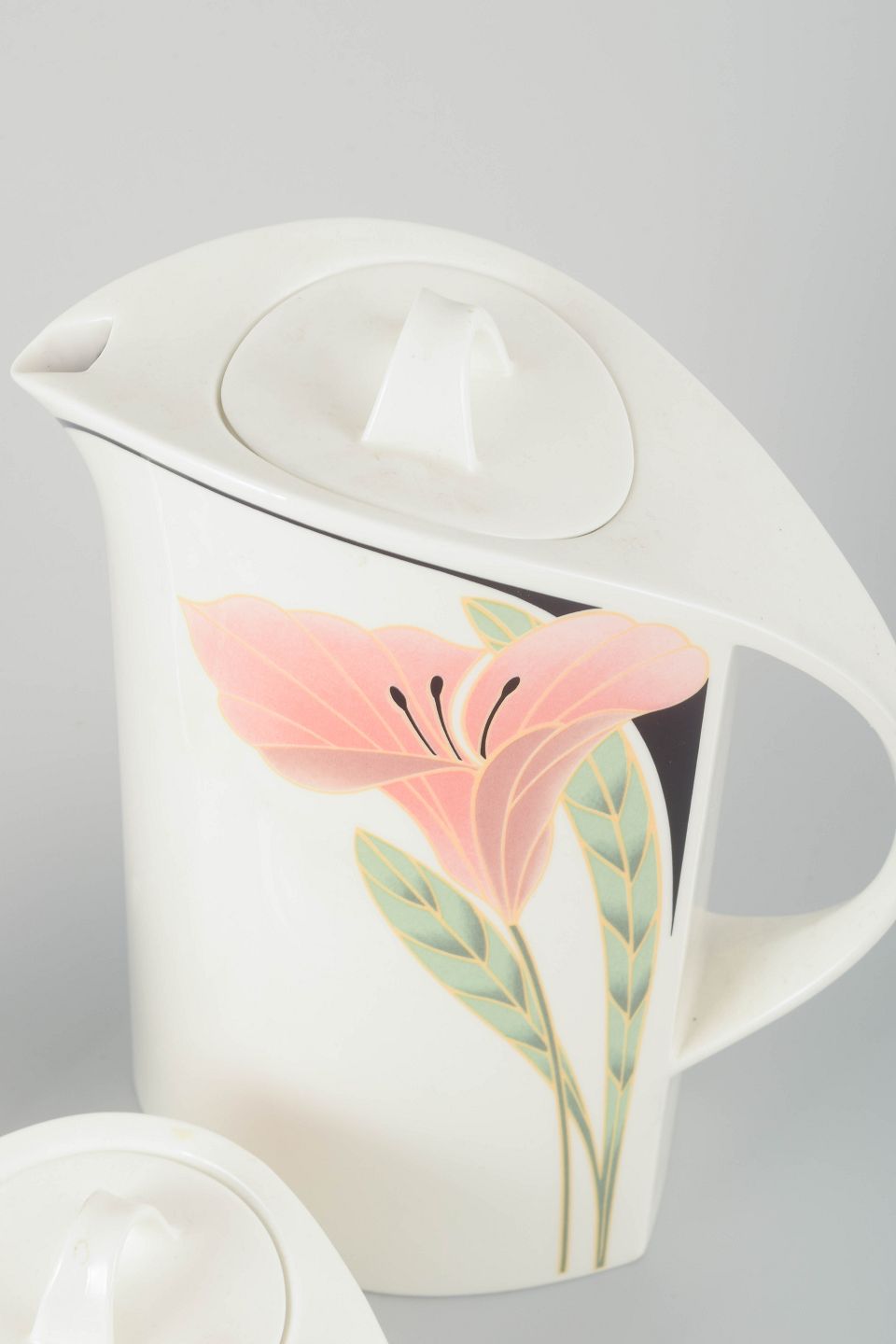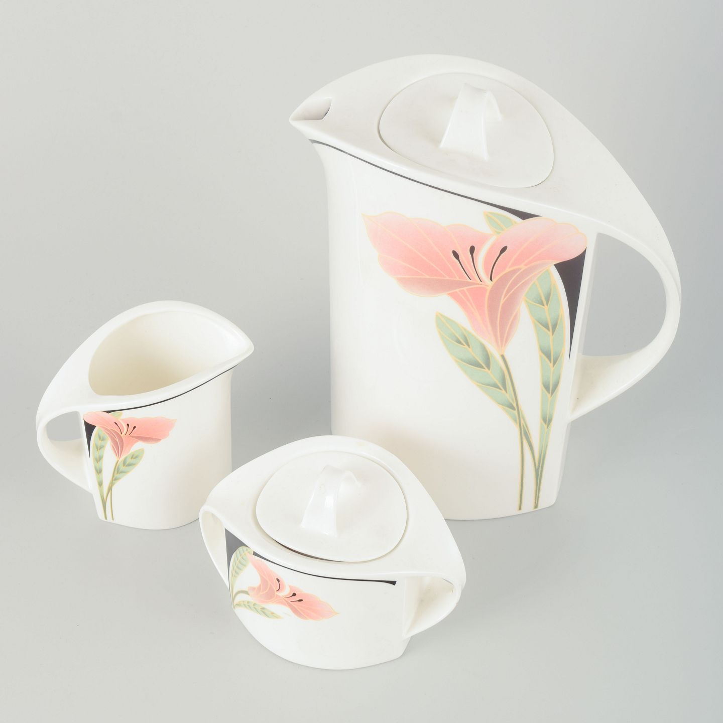 Porcelain coffee pot, sugar bowl and creamer with elegant floral decoration in pink, green and black tones. The design is characterized by soft curved lines and a refined postmodern aesthetic typical of the era.