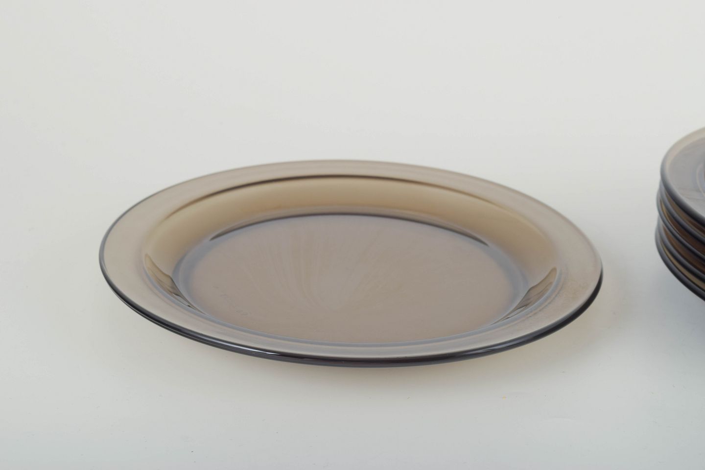 Set of six plates in smoked glass. A classic French design by Vereco, known for its functional household glassware with simple lines and warm tones, characteristic of the 1970s.