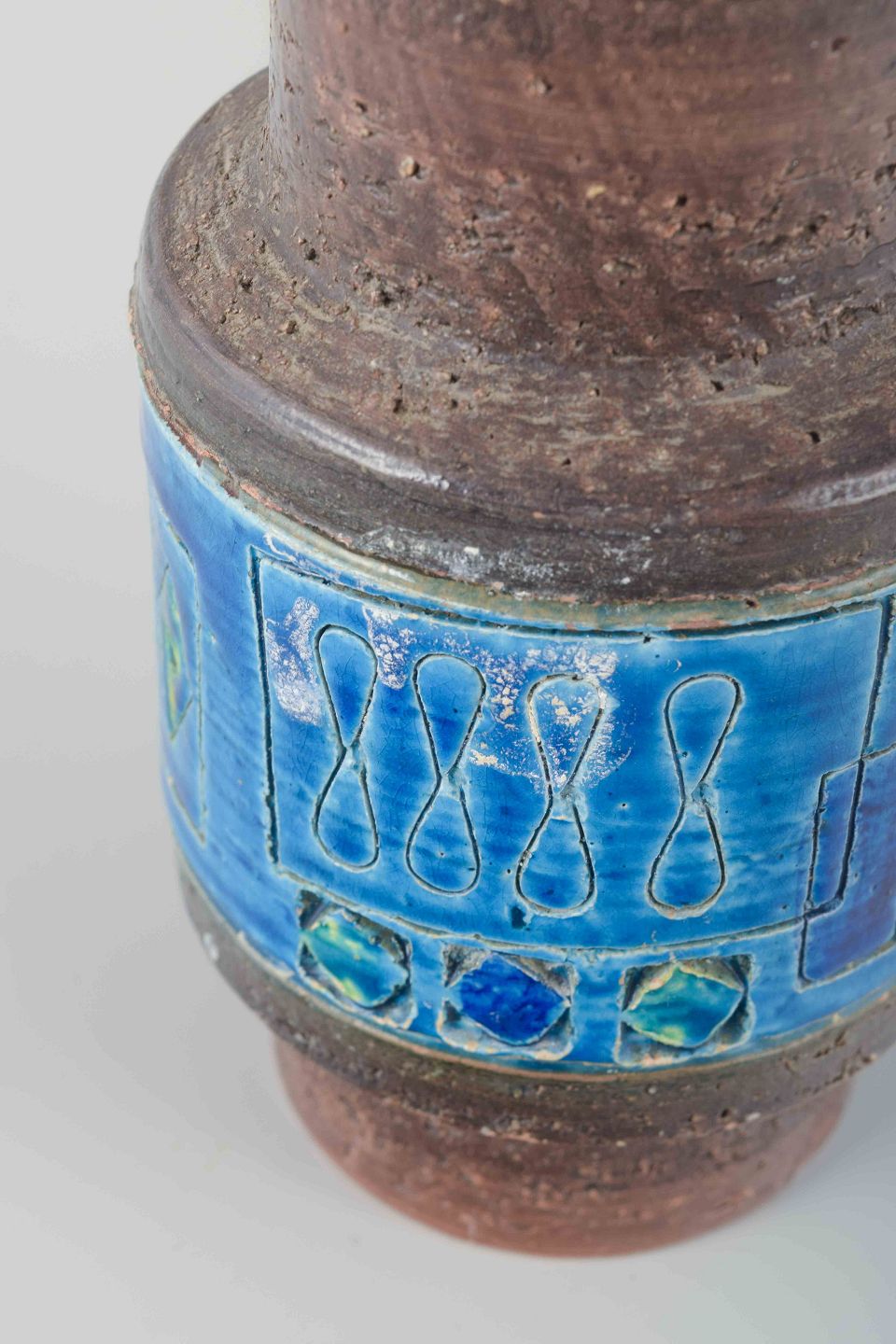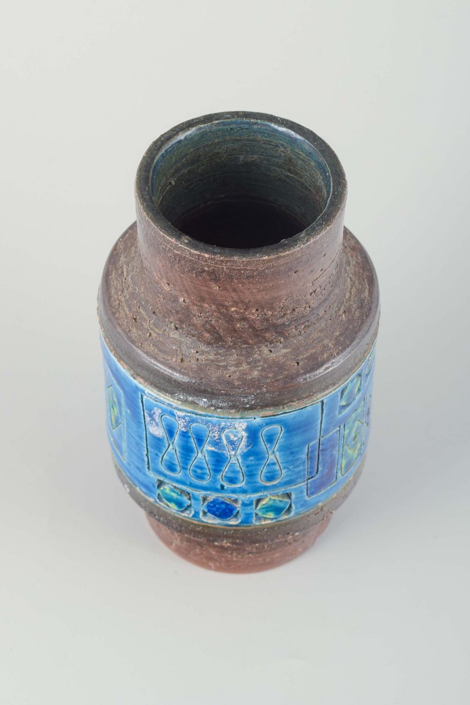 Cylindrical stoneware vase with rustic brown glaze and a decorative band in the characteristic “Rimini Blu” glaze featuring geometric relief decoration in blue, turquoise, and green tones.
