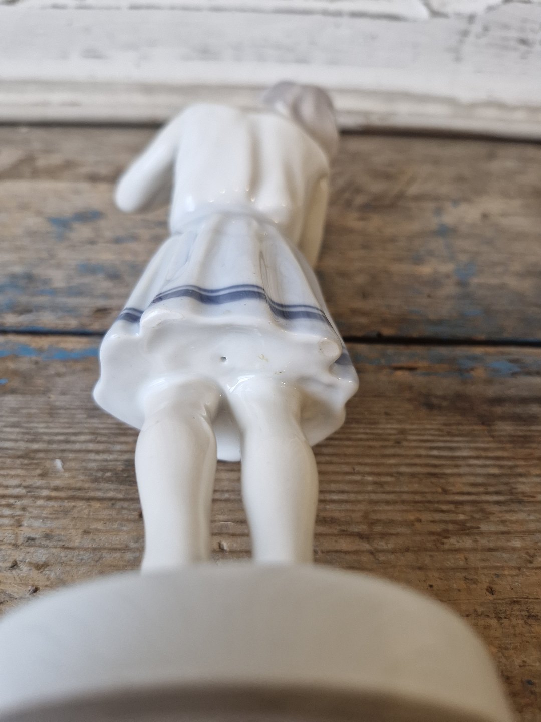 Appears with some glaze grindings under the edge of the dress, done during production.