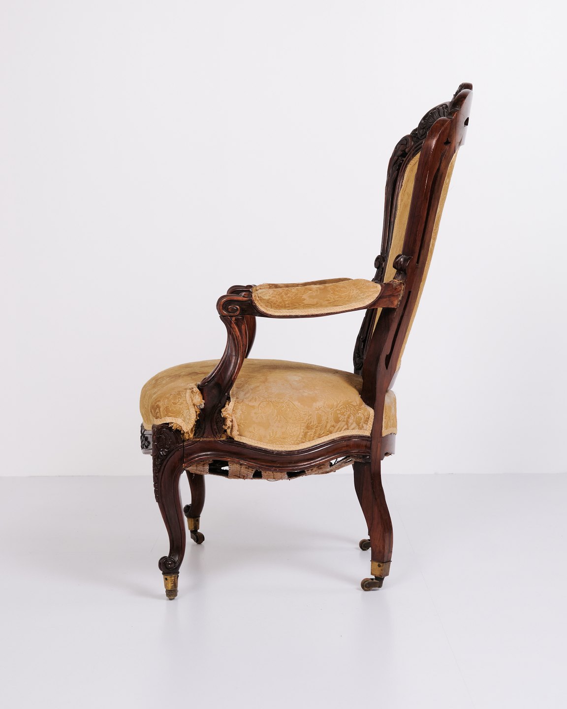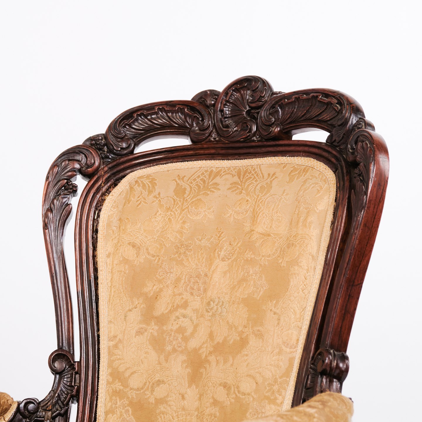 Antique armchair made of mahogany with carved details in the Rococo style, dated to around the 1890s. The seat and back are upholstered with floral upholstery.