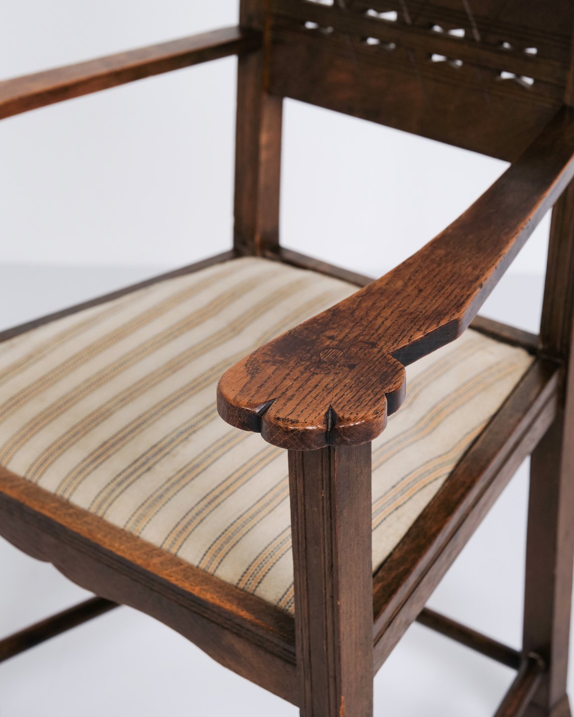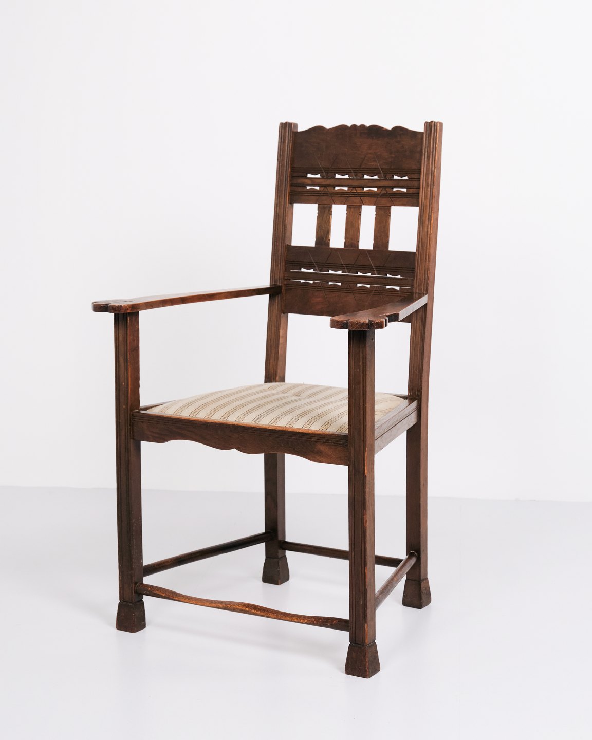 Antique oak armchair from the 1930s with striped upholstery.
