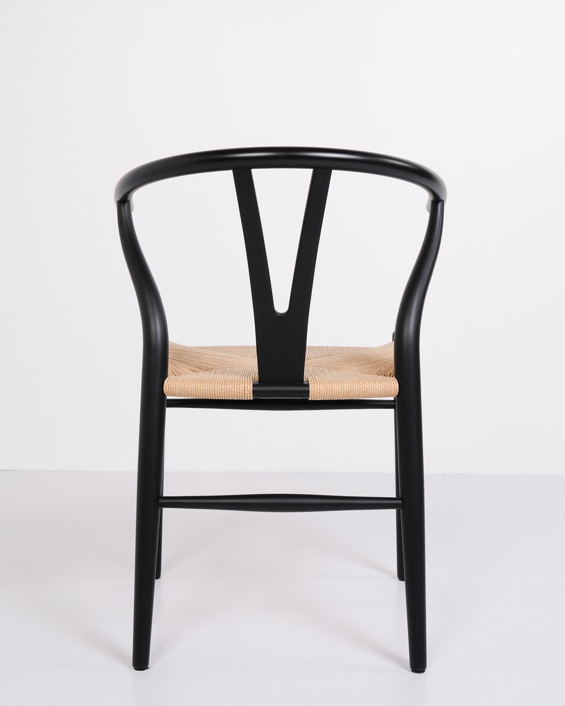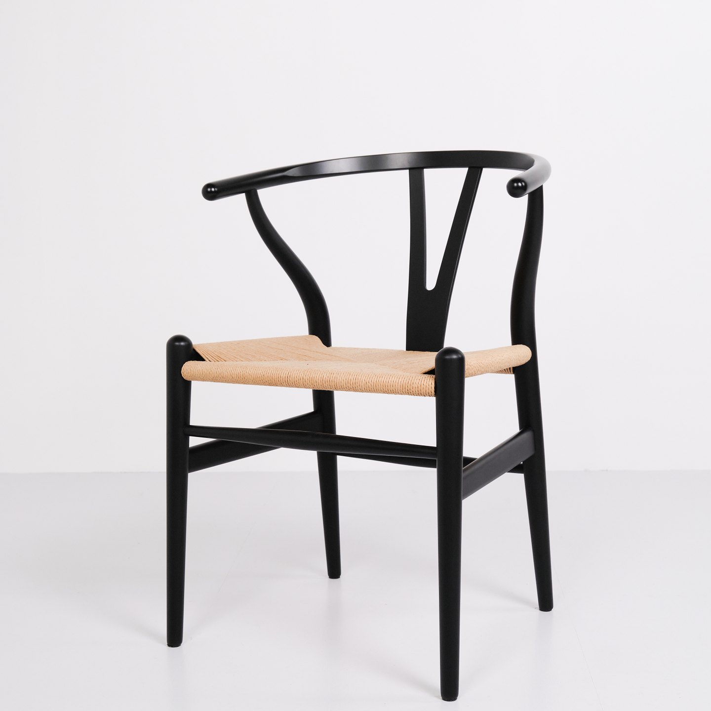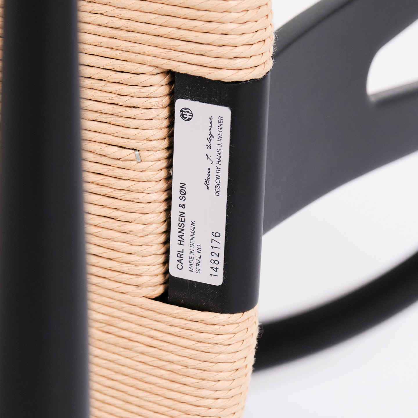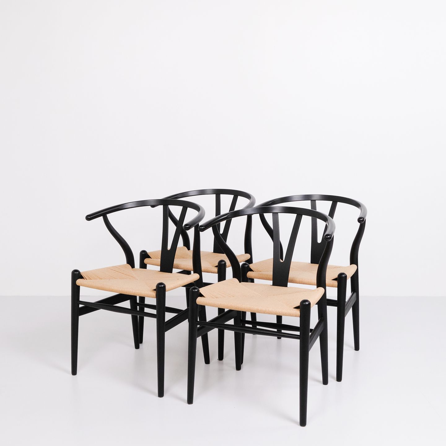 Set of four Wishbone-chairs, model CH24, designed by Hans J. Wegner and produced by Carl Hansen & Søn. The chairs are made of solid wood, lacquered in Soft Black, and with seats in woven natural paper.