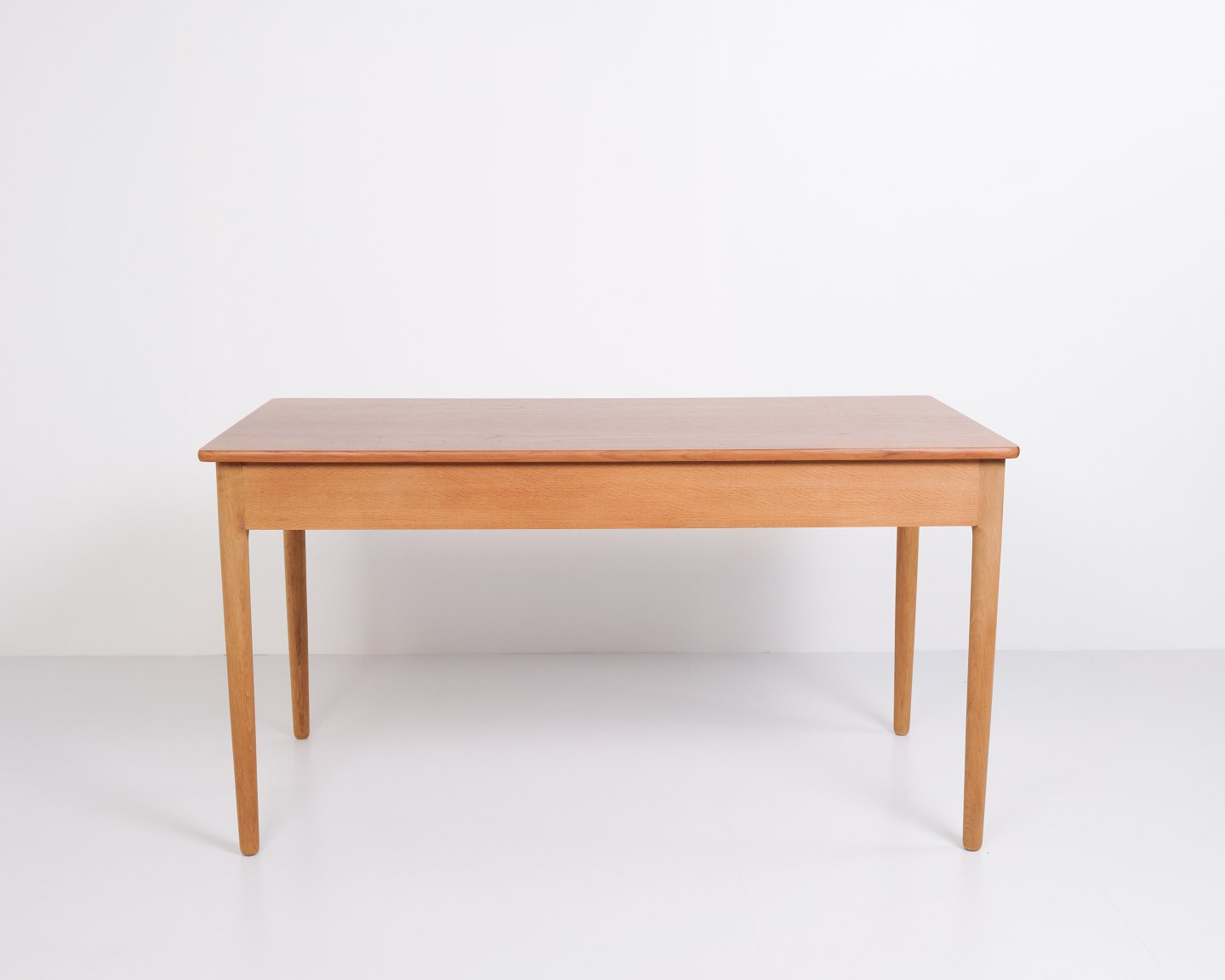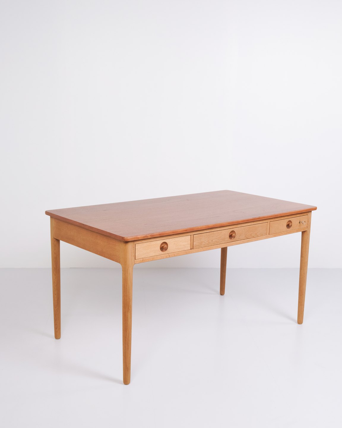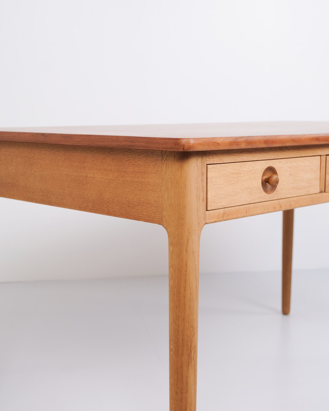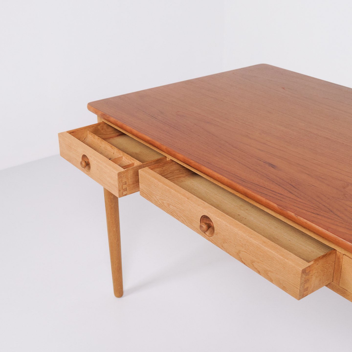 Desk designed by Hans J. Wegner and produced by Andreas Tuck in the 1960s. The table is made of teak with oak leg construction – a classic material combination that highlights Wegner’s sense of proportion and natural balance. The table has drawers in the front.